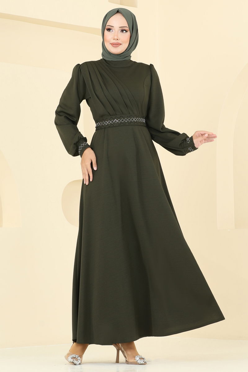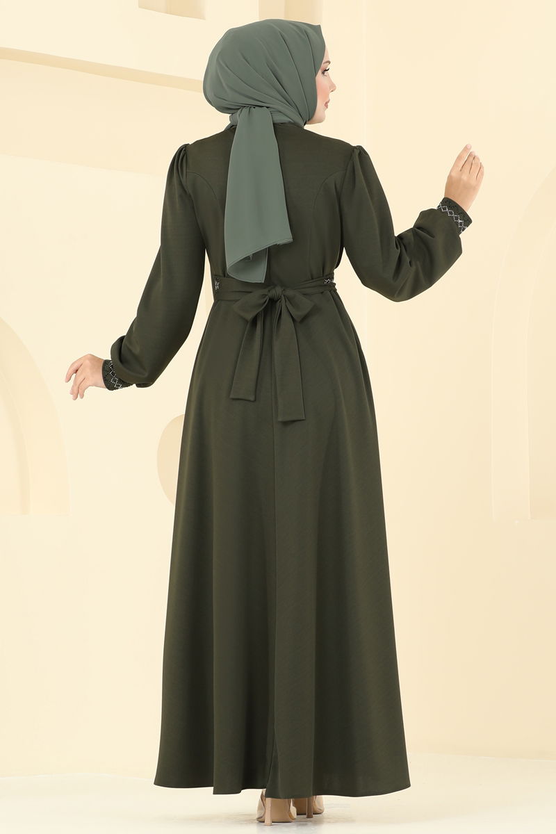 المنتج لديه ياقة نصف بيضوية. غير مبطنة. المنتج به سحاب في جزء من الخلف. يتم لصق الحجارة. المنتج يحتوي على حزام خصر مُخاط. الحزام متضمن، ،يمكن استخدامها حسب الرغبة قد يكون هناك اختلاف في الدرجة اللونية في المنتج بسبب التقاط الصور الفوتوغرافية.