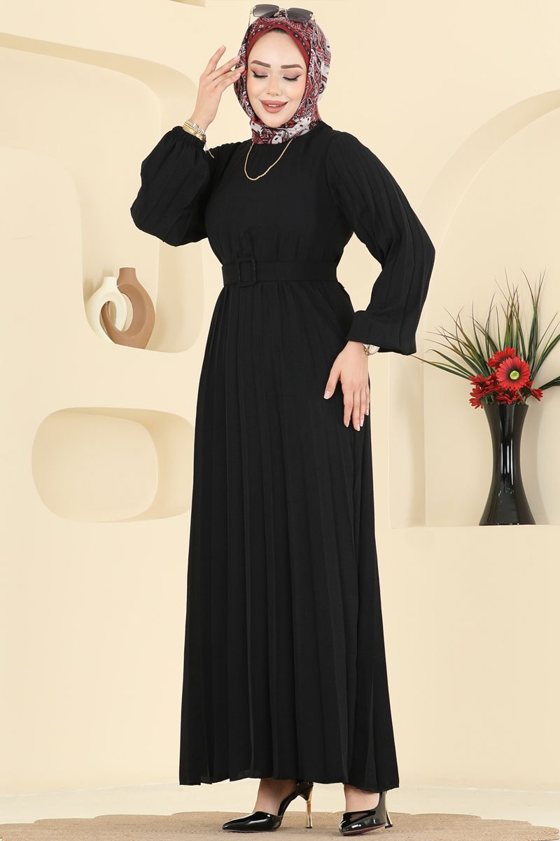 The Pleated Detail Belted Dress is a modest wear model suitable for all seasons. It can be washed at 30 degrees on a gentle cycle. This stylish dress features a crew neck and is without lining. The belt, shown on the standard size 38 model, is stitched at the ends to prevent wavering and left unstitched in the middle. The belt comes with the dress but can be optionally removed. With its elastic cuffs, this dress offers both elegance and comfort.