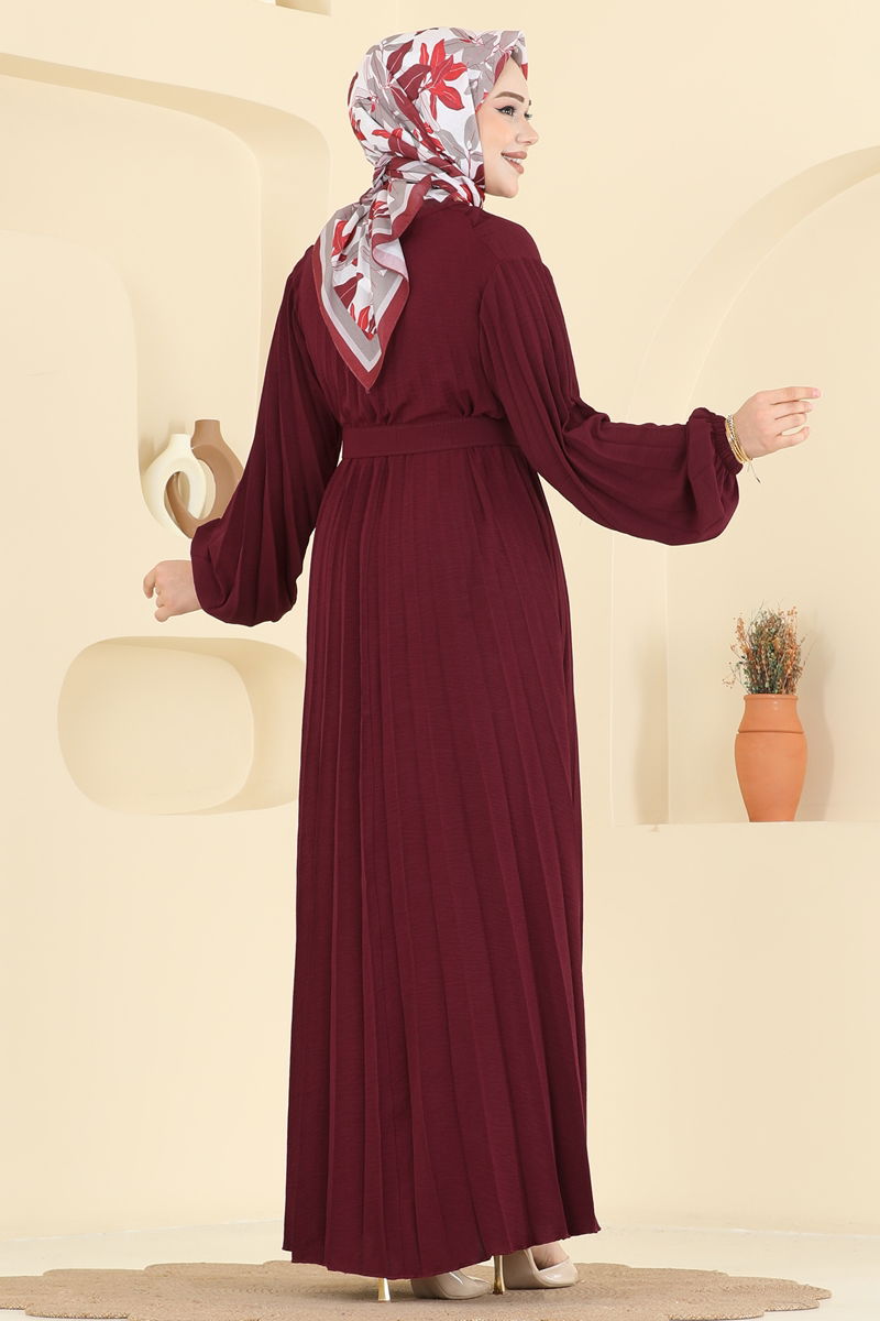 The Pleated Detail Belted Dress is a modest wear model suitable for all seasons. It can be washed at 30 degrees on a gentle cycle. This stylish dress features a crew neck and is without lining. The belt, shown on the standard size 38 model, is stitched at the ends to prevent wavering and left unstitched in the middle. The belt comes with the dress but can be optionally removed. With its elastic cuffs, this dress offers both elegance and comfort.