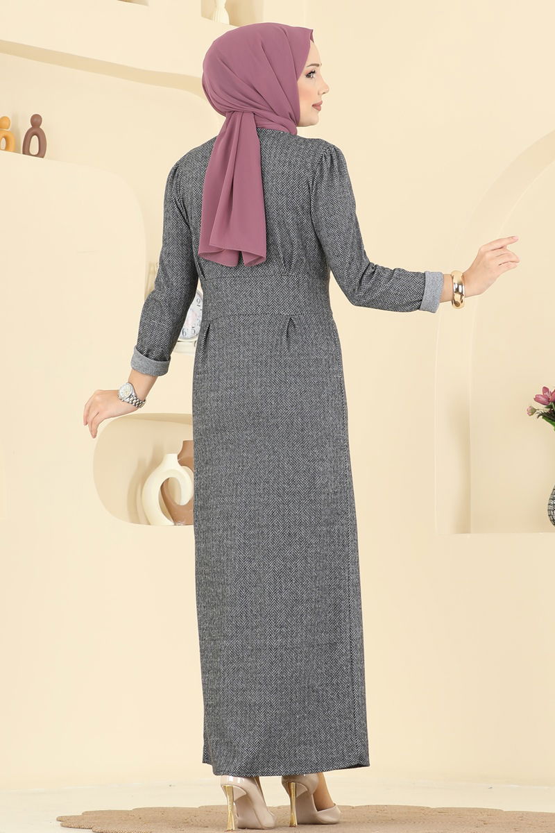 Featuring a stylish and modern design, this herringbone dress with front buttons is an ideal choice for modest wear. Suitable for the autumn and winter seasons, this dress can be gently washed at 30 degrees. It offers practical use with its crew neck and buttoned front, and is lightweight and comfortable thanks to its unlined structure. Its belted design provides an elegant silhouette. The product displayed on the model is size 38.