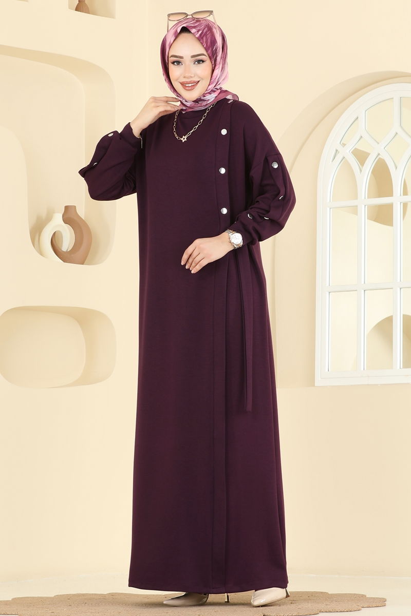 The Accessorized Snap Button Modal Dress is a special design hijab product that can be comfortably worn in all four seasons. Made from modal fabric, this dress can be washed at 30 degrees on a gentle cycle. Its bicycle neck design offers a modern look, while its lining-free structure ensures light and comfortable wear. With its side-tie belt and snap button details, this dress will become an essential part of your wardrobe, combining elegance and comfort.