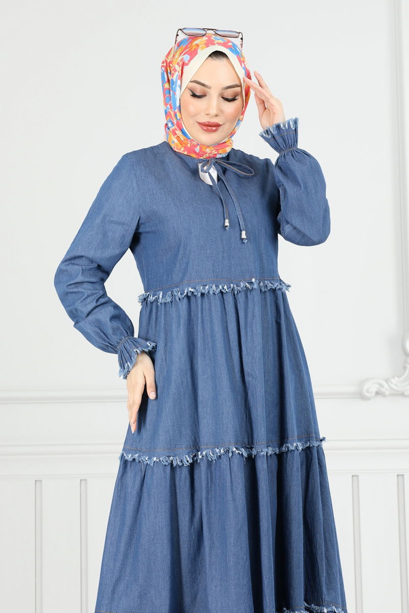 Elevate your style in every season with this chic Layered Skirt Denim Dress. Suitable for all-season use, this dress is easy to care for with its 30-degree gentle wash feature. The perfect blend of Tencel denim offers both comfort and elegance. Its V-neck design and unlined structure ensure a comfortable fit. With elasticated cuffs, this model is easy to slip on, offering convenience in wear. Dazzle in any setting!