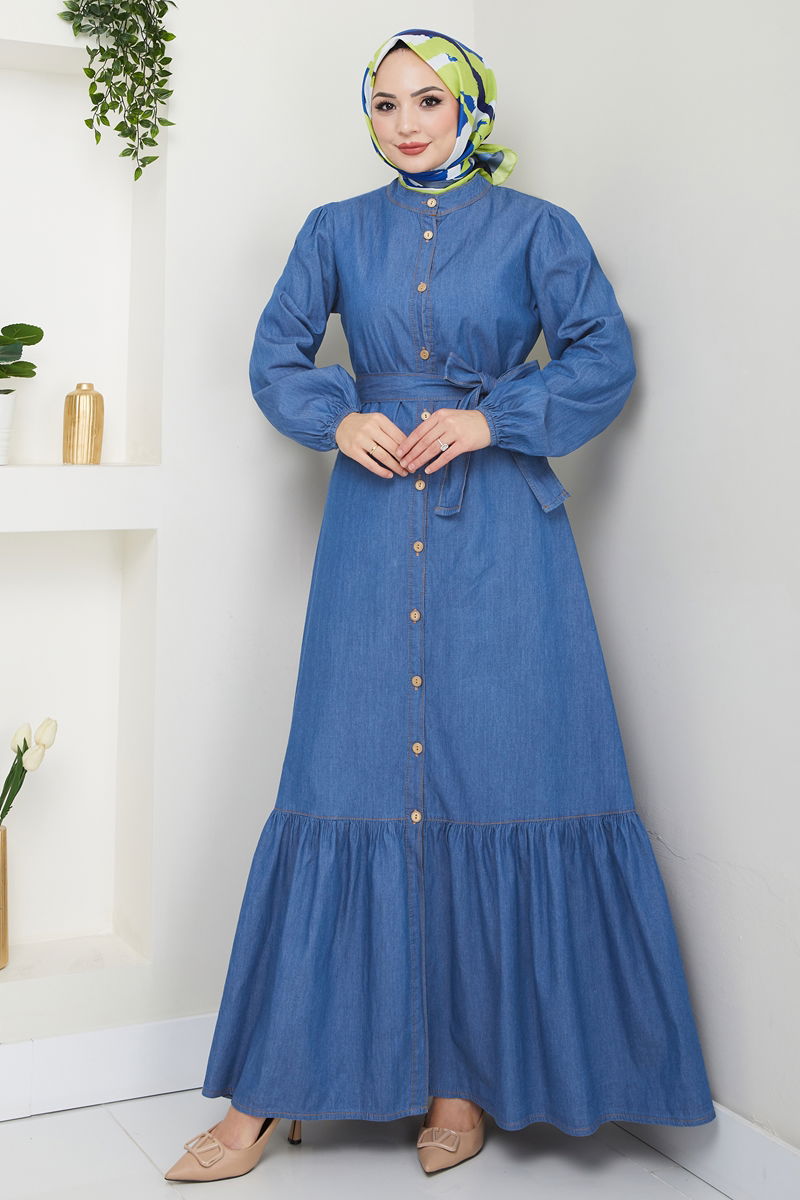 The Elastic-Cuffed Denim Dress is a versatile Hijab-friendly model suitable for all-season use. Made from 100% denim, this elegant dress is suitable for delicate washing at 30 degrees. It features a stand-up collar and front button details. The lining-free design ensures it is lightweight and functional. The dress is completed with elastic cuffs and an optional belt. The belt can be used or removed as desired. Complete your daily outfits effortlessly with this chic and practical denim dress.