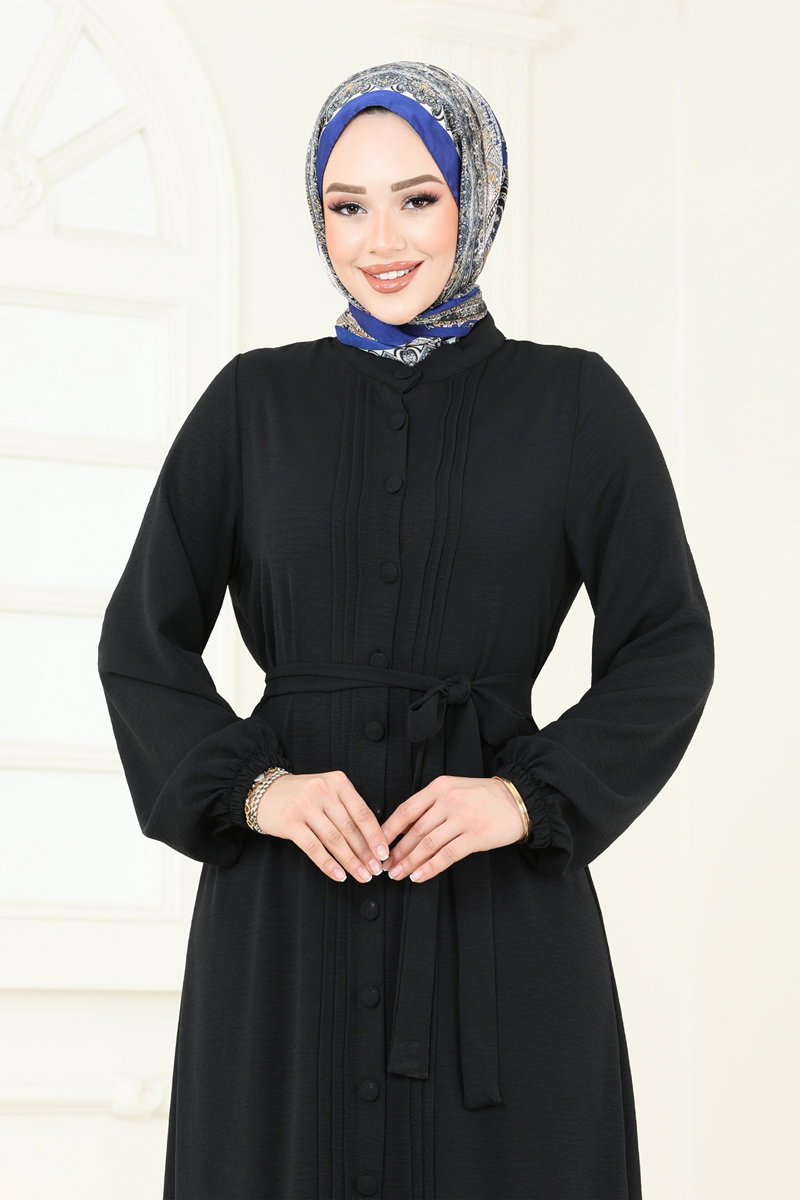 The Front-Buttoned Hijab Dress is suitable for all seasons. Made from Aerobin fabric, this dress can be washed at 30 degrees on a gentle cycle. It features a half mandarin collar and buttoned front, providing a lightweight and comfortable wear as it is unlined. The included belt has both ends stitched while the middle part is left without stitching, offering a smoother appearance. The belt is optional. Elastic cuffs ensure ease of wear. The product model shown is in size 38.