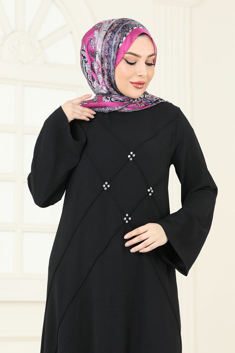 The Stone Detail Hijab Dress combines elegance and comfort in one design, suitable for all seasons. Made from aerobin fabric, this dress is lightweight and breathable, ensuring comfort all day long. It features a crew neck and is unlined for a modern look, and can be washed gently at 30 degrees. The stone detailing adds a stylish sparkle to the dress. The product displayed is size 38 and the dress is worn over the head.