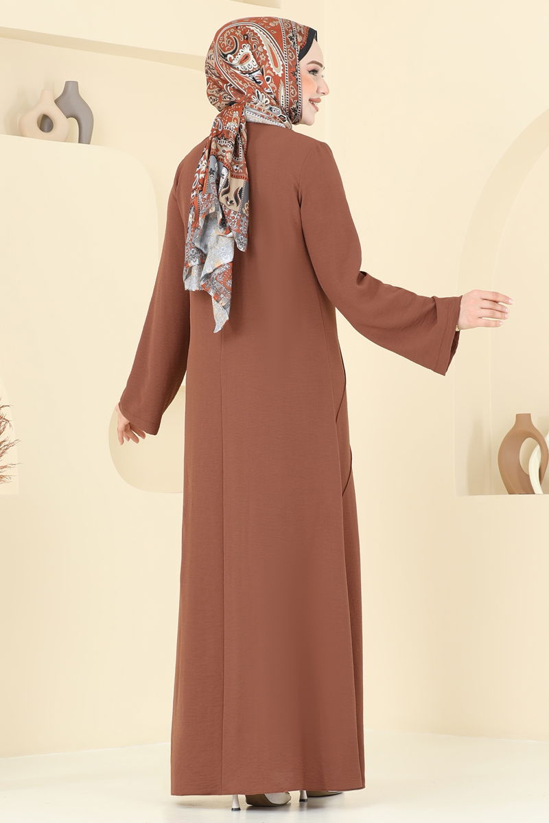 The Stone Detail Hijab Dress combines elegance and comfort in one design, suitable for all seasons. Made from aerobin fabric, this dress is lightweight and breathable, ensuring comfort all day long. It features a crew neck and is unlined for a modern look, and can be washed gently at 30 degrees. The stone detailing adds a stylish sparkle to the dress. The product displayed is size 38 and the dress is worn over the head.
