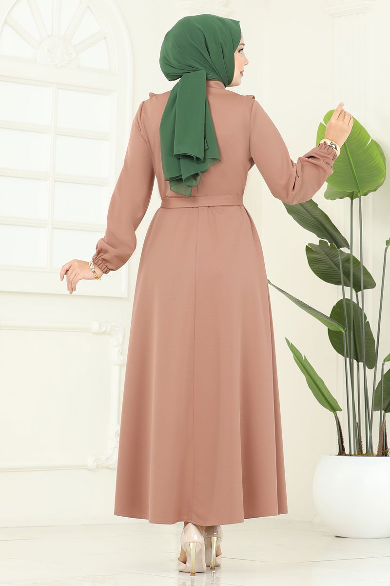 The Floral Embroidered Dabıl Dress is a specially designed modest wear suitable for all seasons. It can be washed gently at 30 degrees and is made of knitted Dabıl fabric. Featuring a shirt collar design, this dress offers practicality with its half-button front closure. Unlined, with embroidered details and elastic cuffs, it combines elegance with comfort. The belt of the dress is stitched at both ends to prevent sagging, with an unstitched middle section, and can be optionally removed.