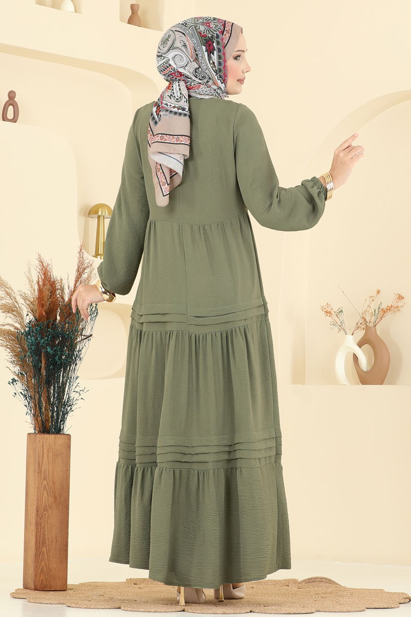 يوجد زر يمكن استخدامه من الخلف. المنتج لديه ياقة دائرية. غير مبطنة. المنتج يحتوي على حزام خصر مُخاط. السوار مطاطي. قد يكون هناك اختلاف في الدرجة اللونية في المنتج بسبب التقاط الصور الفوتوغرافية.
