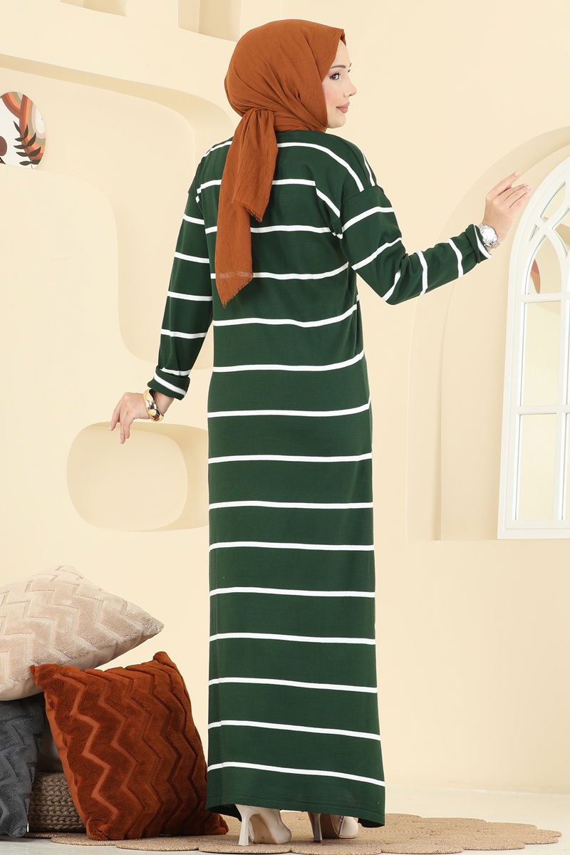 The Striped Knit Dress is a modest wear model suitable for autumn and winter seasons. It can be washed gently at 30 degrees and is made from knit fabric. The dress features a crew neck and is unlined. It fits standard sizes 36-38-40-42 perfectly.