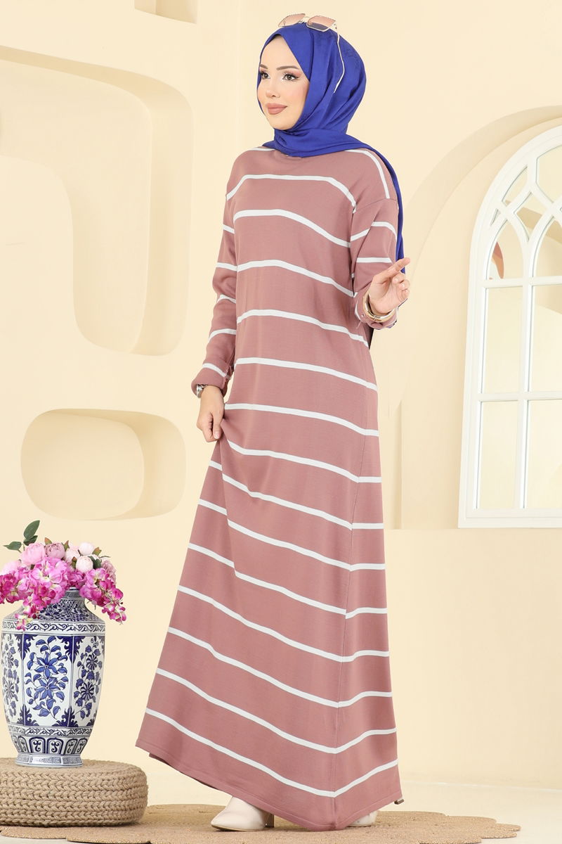 The Striped Knit Dress is a modest wear model suitable for autumn and winter seasons. It can be washed gently at 30 degrees and is made from knit fabric. The dress features a crew neck and is unlined. It fits standard sizes 36-38-40-42 perfectly.