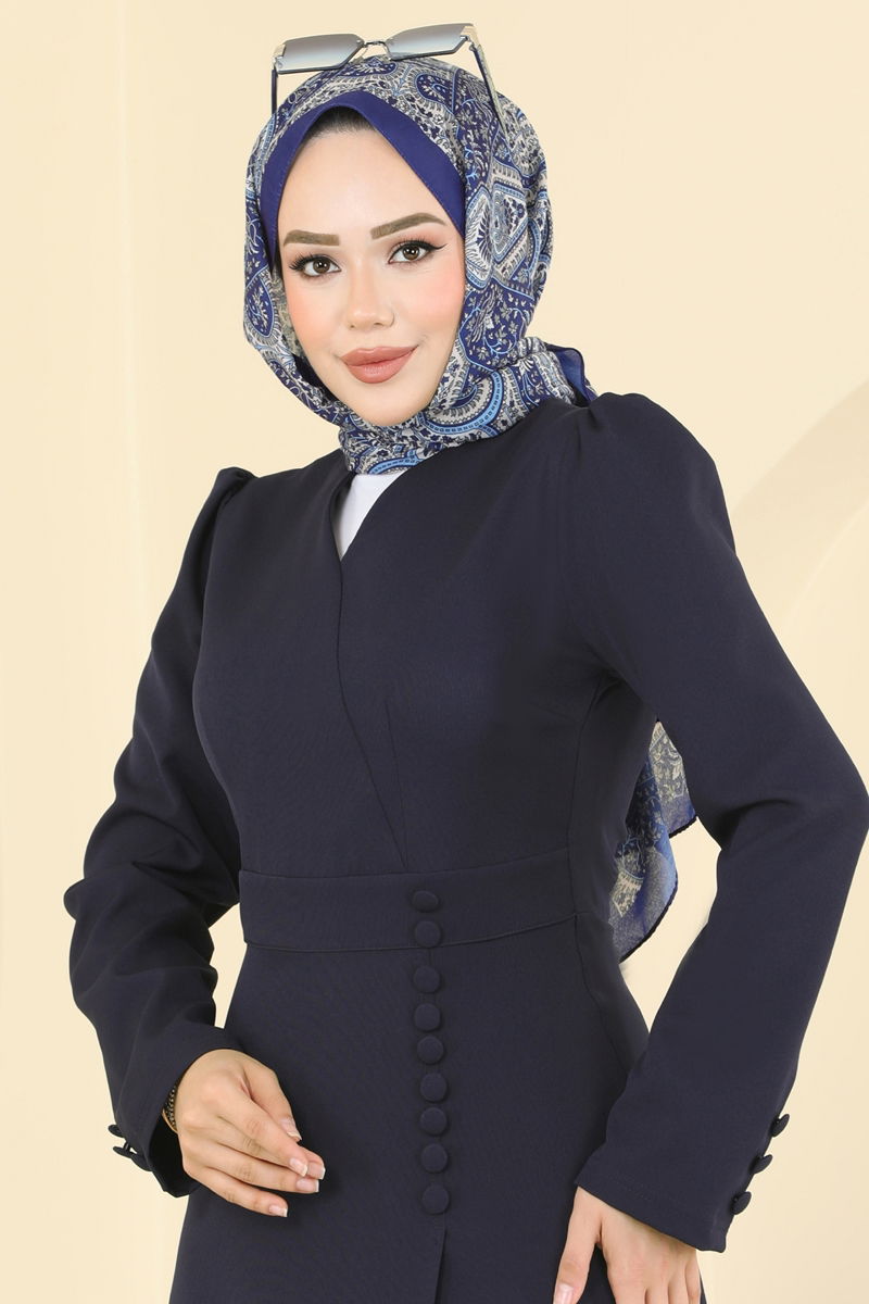 Combining elegance and comfort, the V-Neck Accessory Button Dress is a year-round suitable modest wear. It can be washed with care at 30 degrees and is made from durable yet lightweight Dabil fabric. Designed with a V-neckline and a zipper at the back, it offers practical wearability. The added buttons and cuff details complete your look with a touch of sophistication. Remember, the product model displayed is a size 38.