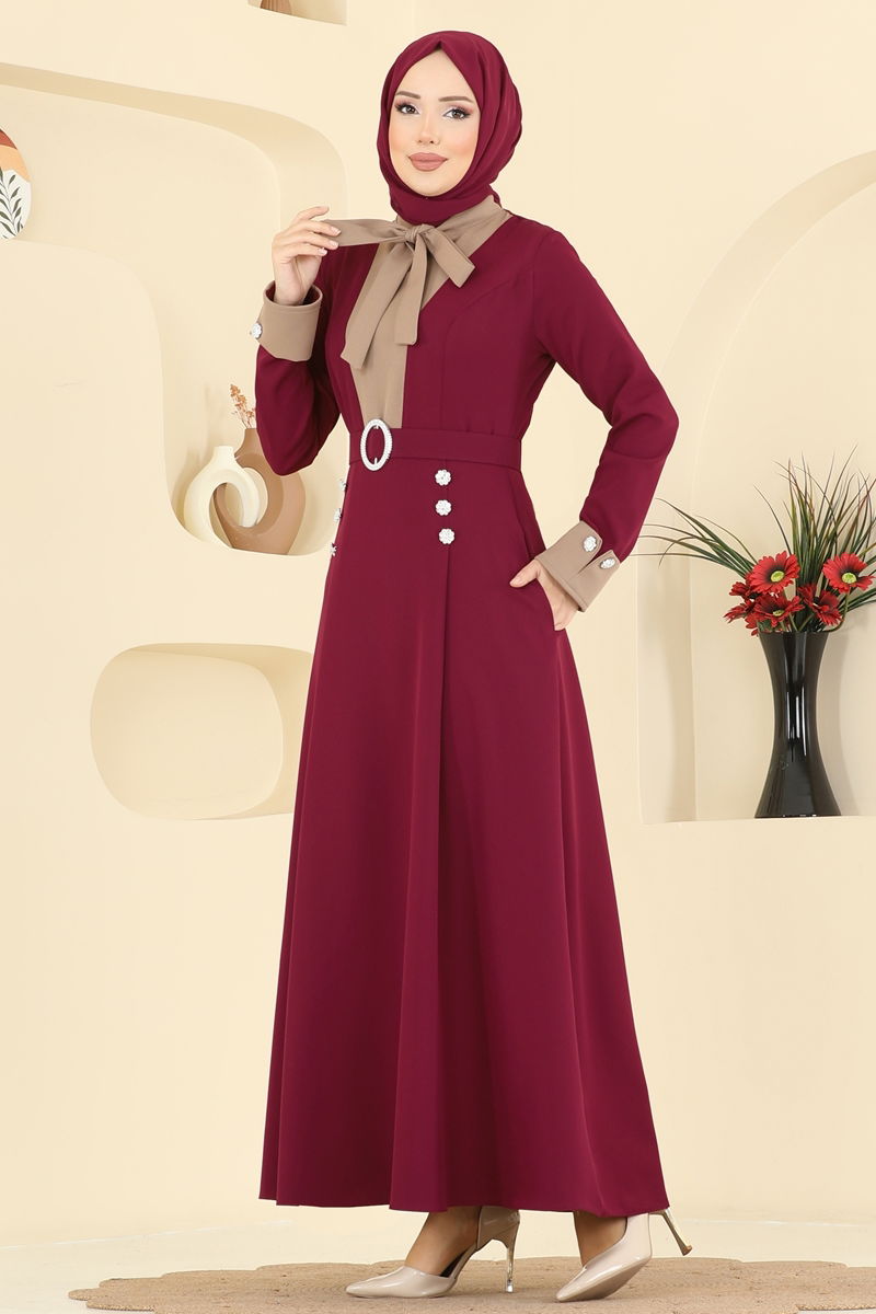 The Gem-Studded Dabıl Dress is a stylish hijab fashion piece suitable for all seasons. Washable at 30 degrees on a gentle cycle, this dress is made from durable Dabıl fabric. It features a scarf collar and is unlined for comfort, while the back zipper makes it easy to wear. Available in size 38 as displayed on the model. The included belt can be optionally removed; its ends are sewn while the middle is stitch-free. The dress also has pockets and decorative cufflinks for added practicality and style.