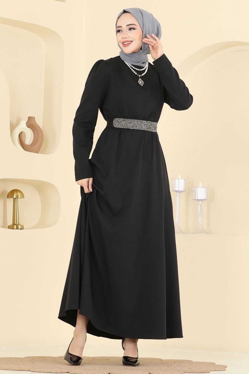 The Sparkling Belt Dabıl Dress is a meticulously designed modest wear suitable for special occasions. Ideal for all seasons, this dress should only be dry cleaned. Made from woven Dabıl fabric, it features a crew neck and a lining-free design for a contemporary look. Its back zipper makes it practical to use. The included belt enhances the elegance of the dress, while the elastic waist ensures comfort. The belt is optional and can be used at your discretion.