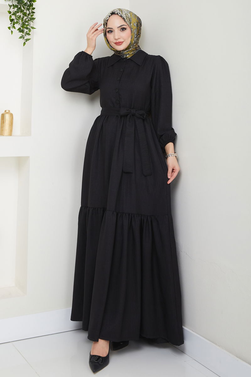 The Ruffled Hem Modest Dress is an elegant option suitable for all seasons. Made from Sofia linen fabric, this dress can be gently washed at 30 degrees. It features a shirt collar and a semi-buttoned front design that offers a modern and chic look. The dress is unlined, and the cuffs are elasticized. The belt detail is stitched at both ends with the center left unstitched and can be optionally used. Size-wise, the product on the model is a size 38.