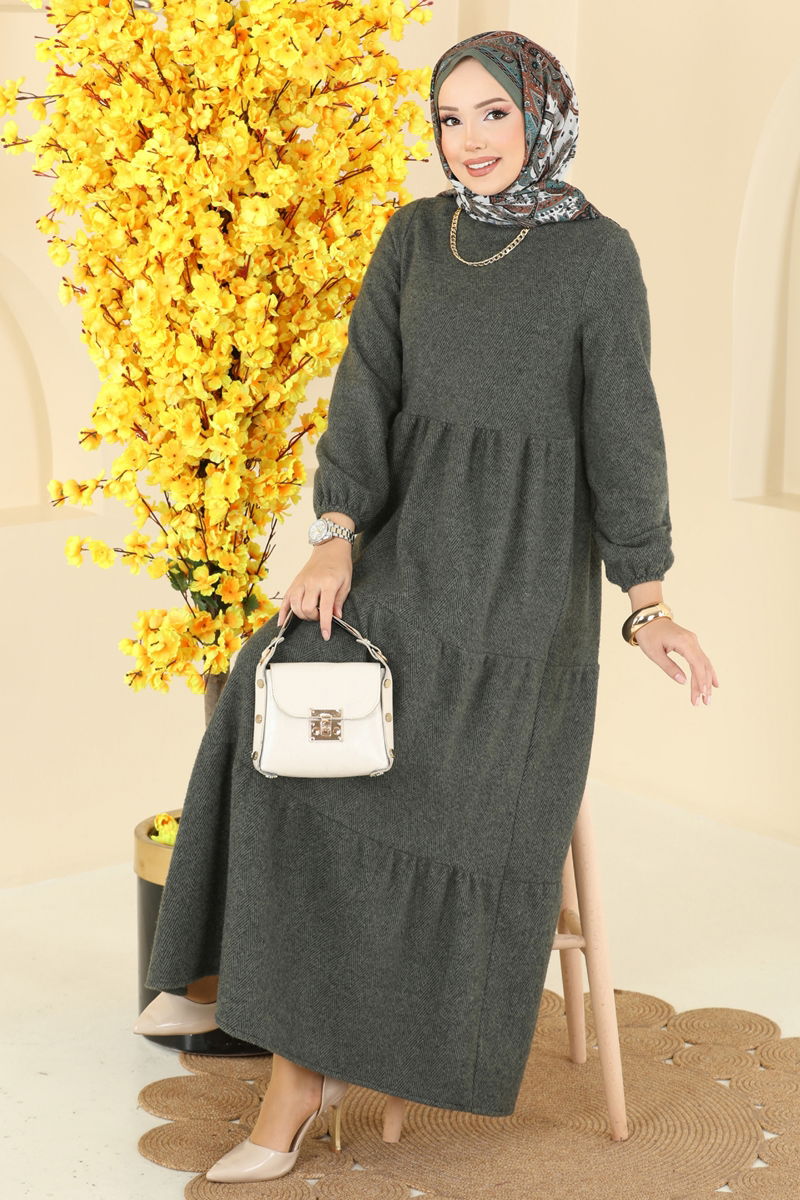 Elegant and chic, the Elastic Cuff Detailed Dress is an ideal choice for modest clothing. Suitable for use in Autumn and Winter, this dress is made from herringbone fabric and can be washed at 30 degrees on a gentle cycle. The crew neck and unlined design offer comfortable wear. Featuring an elastic cuff, this model is noteworthy for its button at the back and its over-the-head ease. The product displayed is in size 38 and does not show the inside.