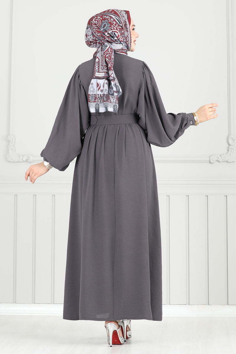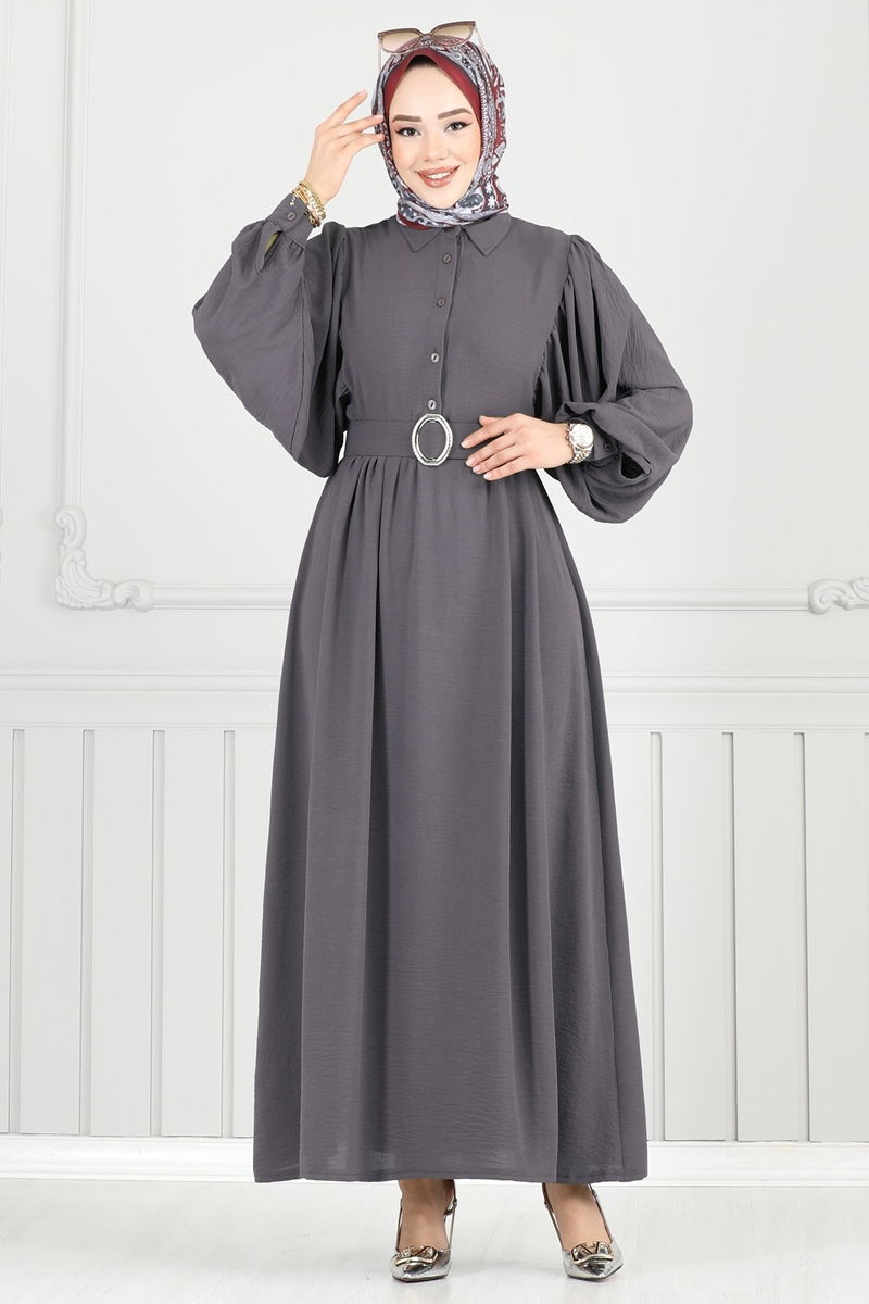 The Coated Belted Modest Dress offers an elegant choice that can be comfortably worn across all seasons. Its delicate aerobin fabric enhances comfort while being washable at 30 degrees without squeezing, facilitating easy maintenance. Featuring a shirt collar and half-button front design, it presents a trendy look. This unlined model comes in size 38 with functional cuff buttons. The belt is designed with stitched ends to prevent waving, left open in the middle, and can be optionally removed.
