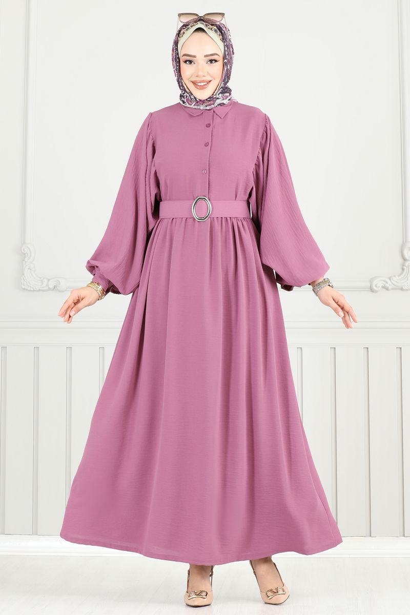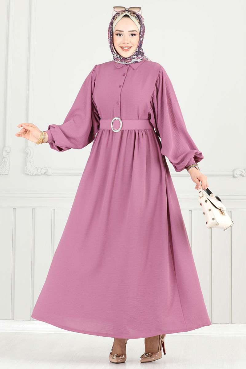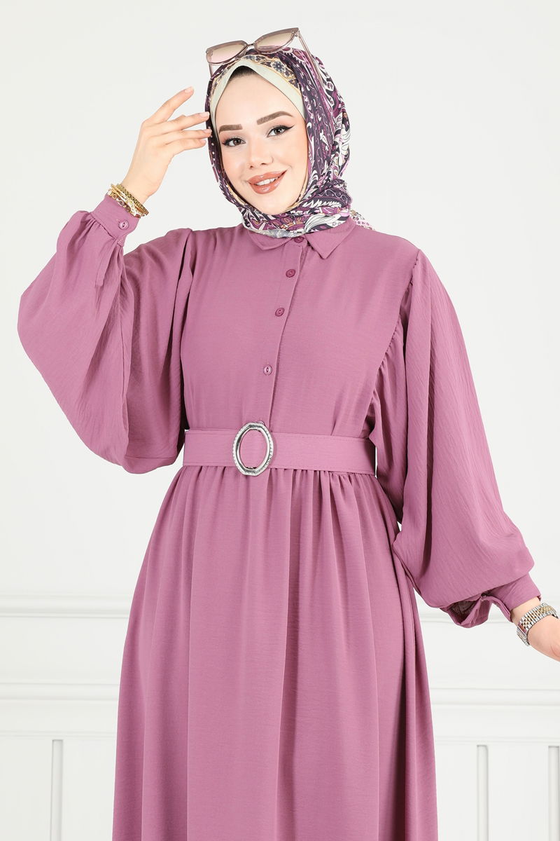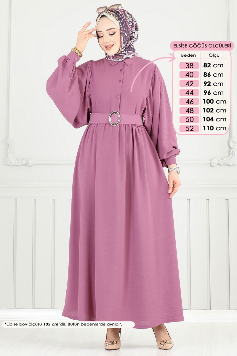 The Coated Belted Modest Dress offers an elegant choice that can be comfortably worn across all seasons. Its delicate aerobin fabric enhances comfort while being washable at 30 degrees without squeezing, facilitating easy maintenance. Featuring a shirt collar and half-button front design, it presents a trendy look. This unlined model comes in size 38 with functional cuff buttons. The belt is designed with stitched ends to prevent waving, left open in the middle, and can be optionally removed.