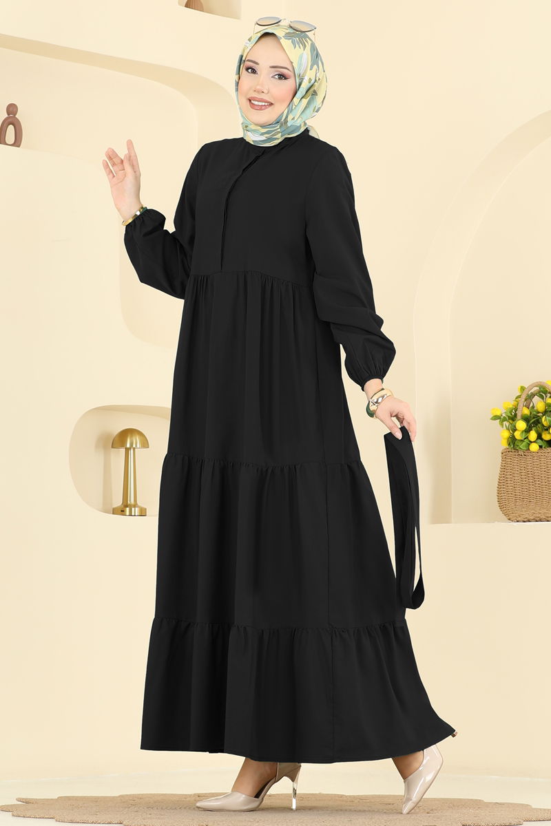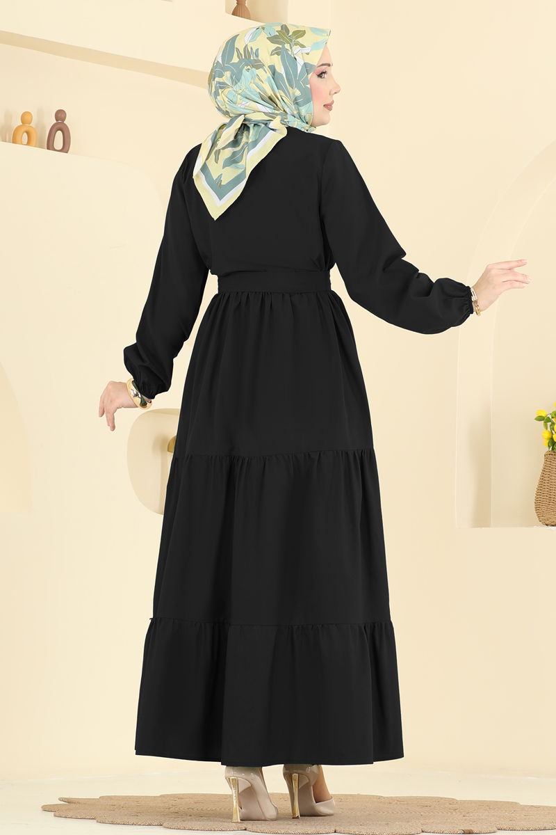 This chic and contemporary Tiered Tericot Dress is comfortably wearable across all seasons. Made from soft tericot fabric, it can be washed gently at 30 degrees. The design stands out with its half mandarin collar and elasticated cuffs, offering practicality with its front buttons. The dress is unlined and comes with a seamed waistband. The belt is designed with stitched ends to prevent waving, leaving the middle part unstitched; the belt is included but can be optionally omitted. The product on the model is a size 38.