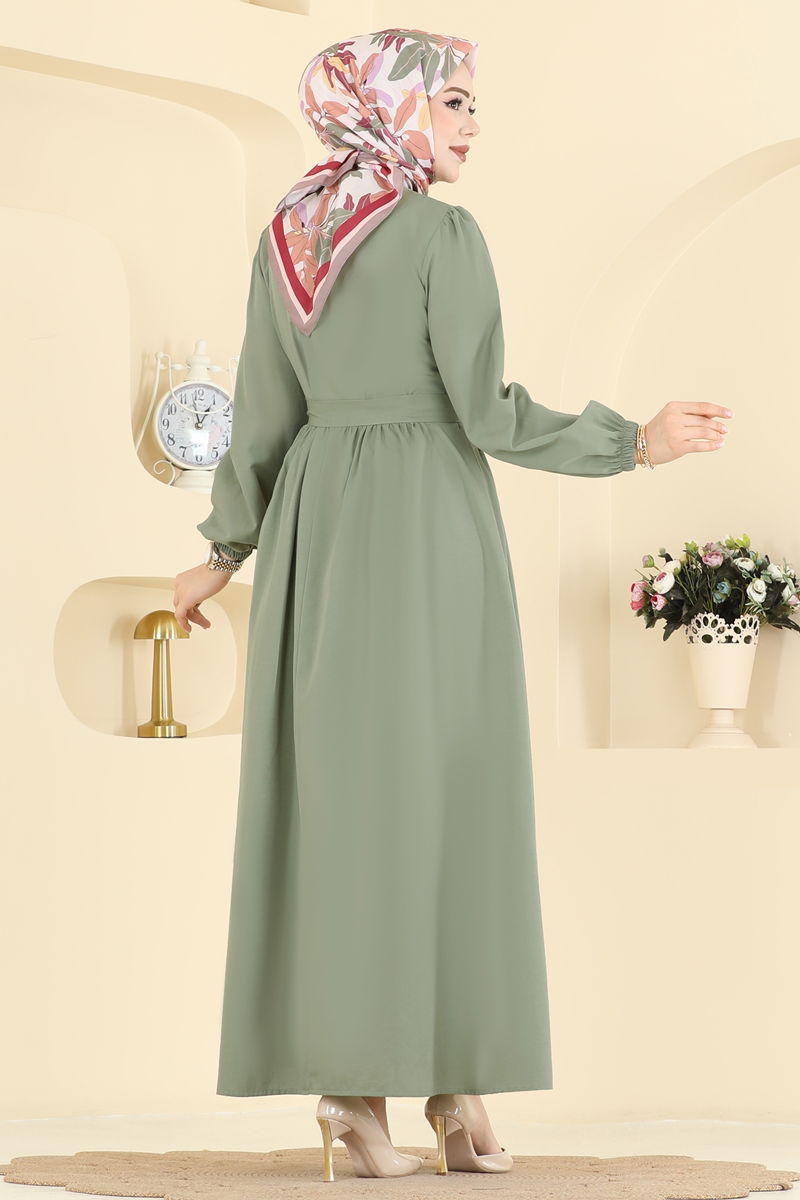 The Belted Terry Cotton Dress is a modest dress suitable for all seasons. It can be washed gently at 30 degrees Celsius, made from terrycotton fabric, and features a half stand-up collar design. It is front half-buttoned and unlined. The waist of the dress is stitched, and the belt is designed with stitched ends to prevent it from sagging, although it is optional and can be removed. With elasticated cuffs, this dress is both stylish and comfortable.