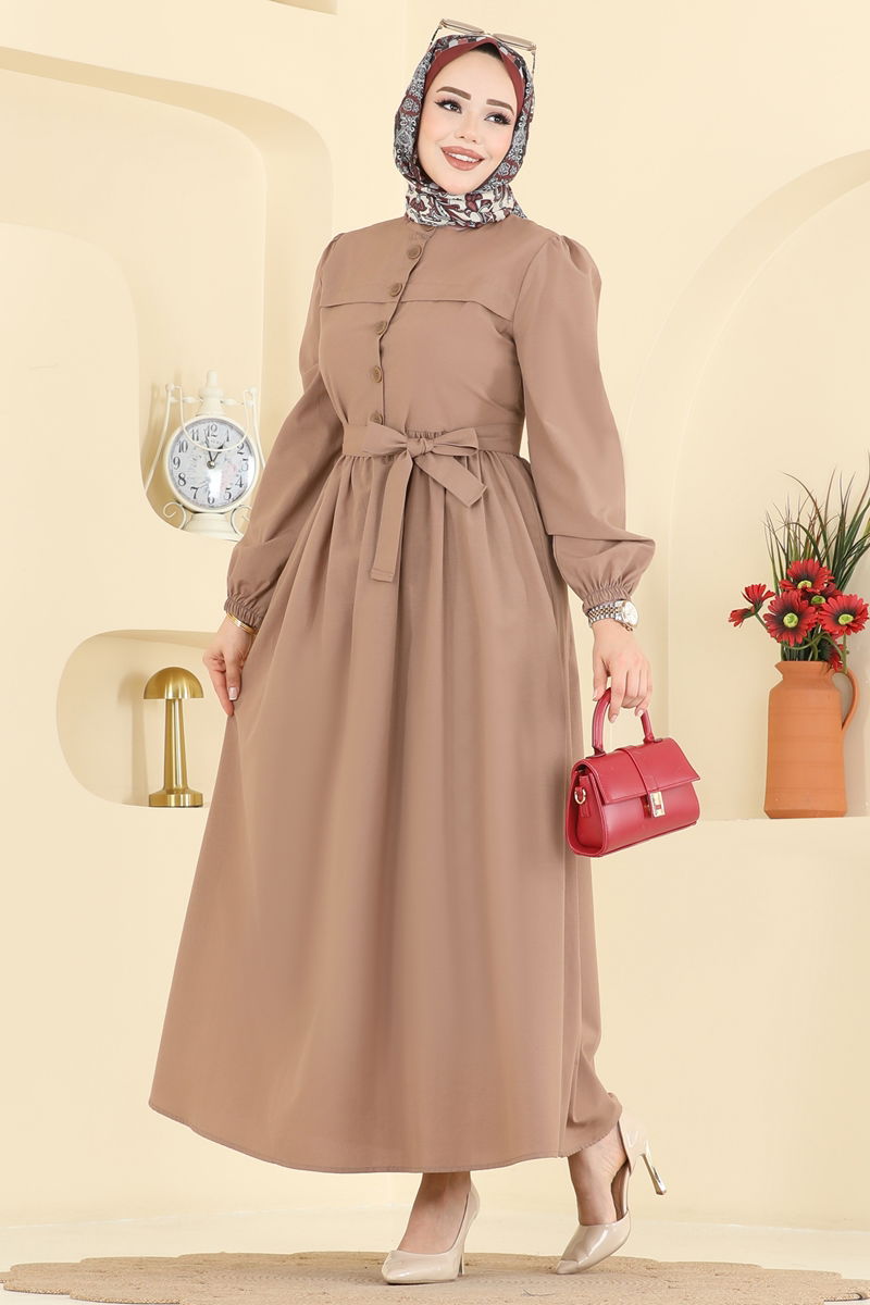 The Belted Terry Cotton Dress is a modest dress suitable for all seasons. It can be washed gently at 30 degrees Celsius, made from terrycotton fabric, and features a half stand-up collar design. It is front half-buttoned and unlined. The waist of the dress is stitched, and the belt is designed with stitched ends to prevent it from sagging, although it is optional and can be removed. With elasticated cuffs, this dress is both stylish and comfortable.