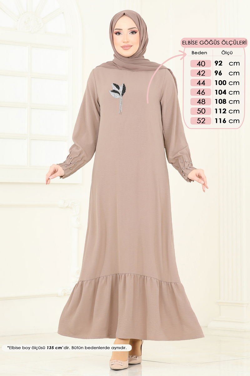 The epitome of elegance, the Stone Detailed Stylish Dress is a modest attire suitable for all seasons. Made from aerobic fabric, it offers lightweight comfort and breathability. The bicycle collar and unlined design provide a modern look, while the cuffs are elasticated and there is a practical button at the back for ease of use. Washable at 30 degrees on a gentle cycle, this dress captures attention with its pearl and stone embellishments. The product model wears size 40 with measurements: Height: 165 cm, Chest: 80 cm, Waist: 68 cm, Hip: 96 cm, Weight: 54 kg.