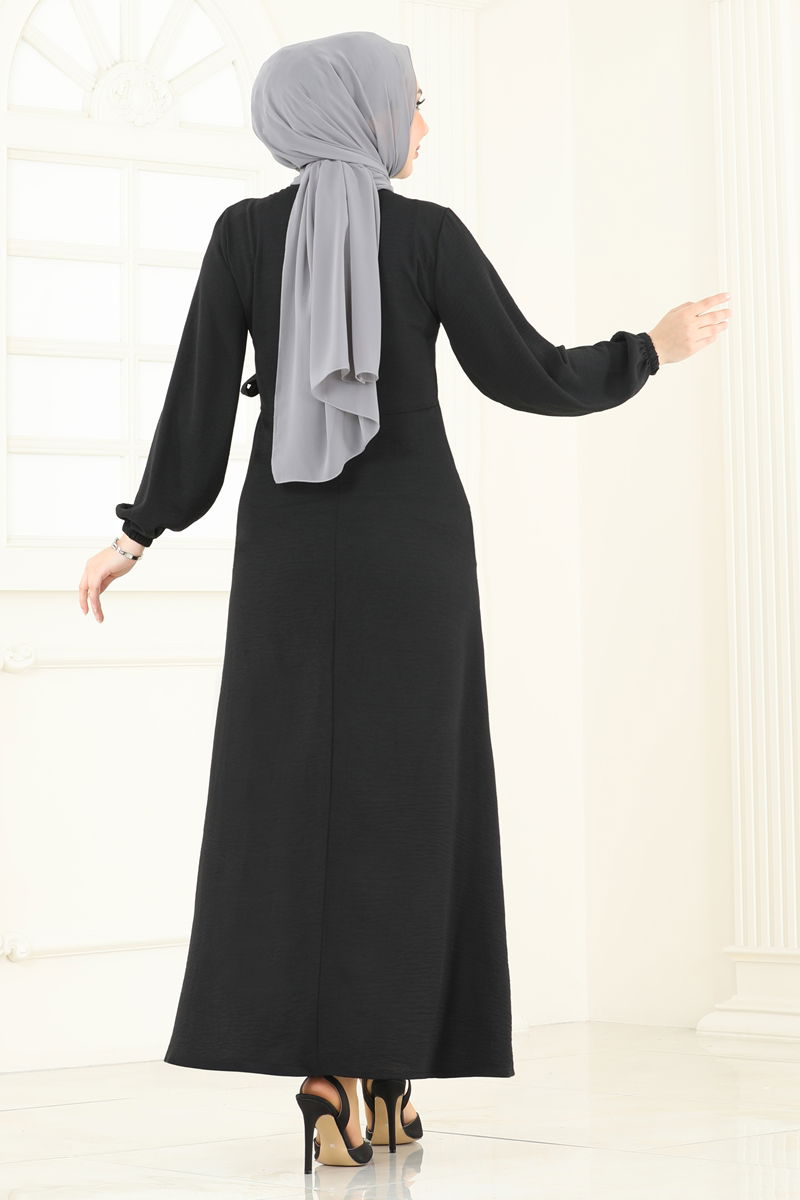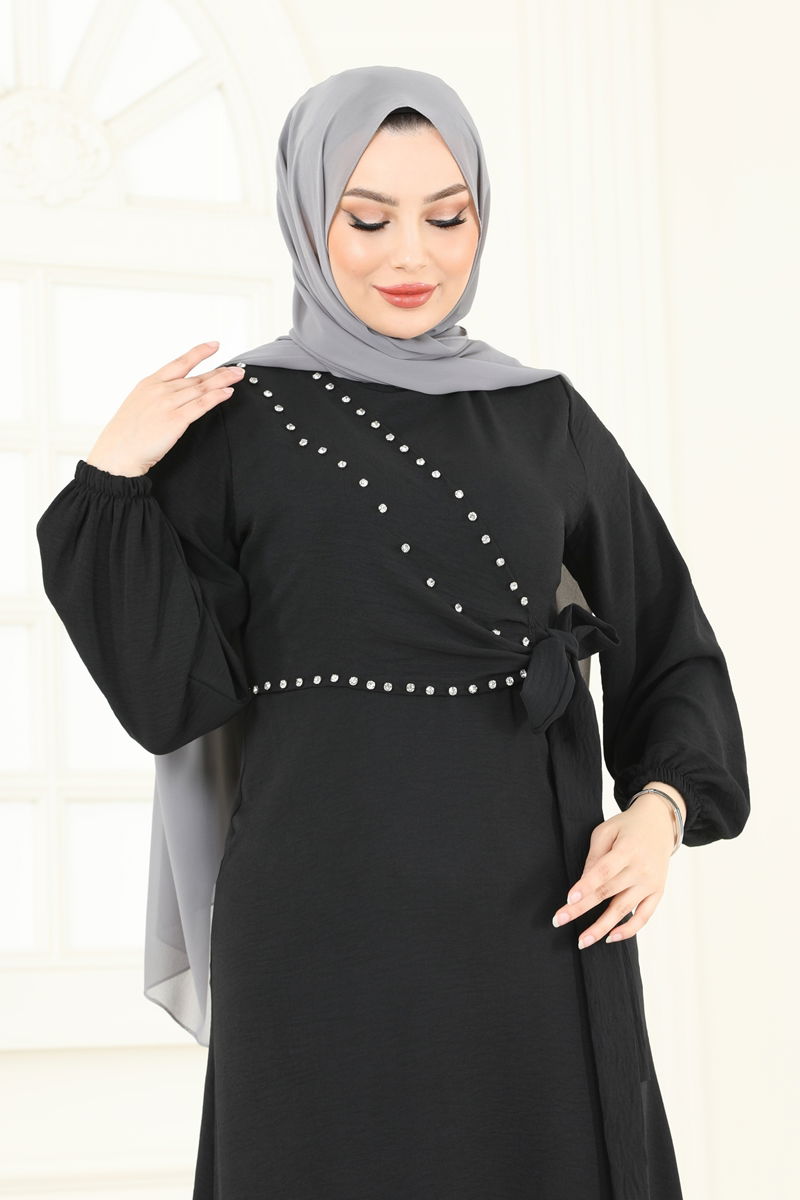 Featuring a modern and elegant design, this Side-Tie Gemstone Dress can be comfortably worn in all seasons. Made from aerobin fabric, this modest dress can be cleaned with a gentle wash at 30 degrees. With a crew neck and elasticated cuffs, this model is unlined and can be easily worn with a single button at the back. The gemstone details dazzle, while the side-tie waist design makes it uniquely attractive. Ideal for special occasions, this dress offers both elegance and comfort together.