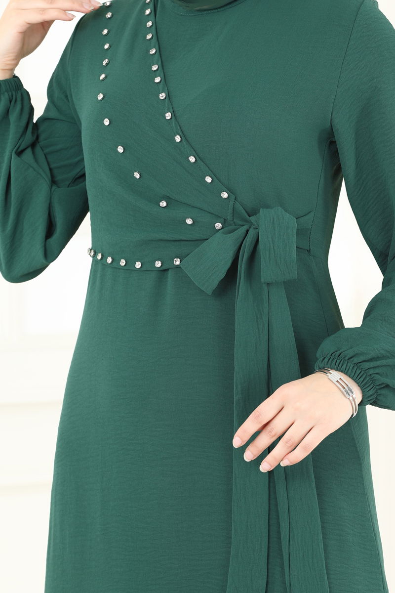 يوجد زر يمكن استخدامه من الخلف. يتميز بخصر ذو أربطة. المنتج لديه ياقة دائرية. غير مبطنة. التفاصيل الحجرية محفورة. يتم خياطة الحزام على المنتج. السوار مطاطي. قد يكون هناك اختلاف في الدرجة اللونية في المنتج بسبب التقاط الصور الفوتوغرافية.