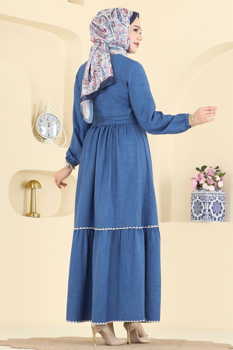 The Embroidered Sofia Dress is a hijab-friendly model that can be comfortably worn in all four seasons. Recommended to be washed gently at 30 degrees without wringing. Made from linen fabric, this elegant dress features a crew neck and is unlined. Its back button detail enhances usability. The waist of the dress is stitched, adorned with embroidery details. The belt adds elegance while its ends are stitched and the middle part is left unstitched to prevent waviness. The belt can be optionally removed. With elastic cuffs, this dress is both comfortable and stylish.