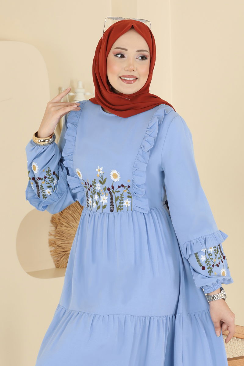 Discover the new Floral Embroidered Poplin Dress, a modest wear-friendly choice suitable for all seasons! Designed to be washable at 30 degrees on a delicate cycle, this dress combines comfort and elegance with its poplin fabric. The crew neck and unlined design offer a comfortable fit, while the back zipper makes it easy to wear. The elasticated waist and cuffs add extra comfort, and the attached belt and embroidery details enhance the dress's elegance. A must-have in every stylish woman's wardrobe, this dress ensures an elegant look in any setting.