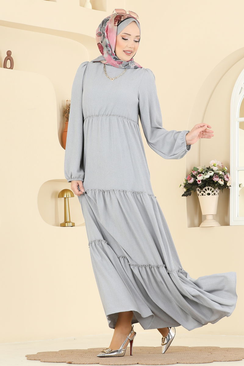 The Layered Skirt Crepe Dress epitomizes elegant modest fashion. Suitable for all seasons, this dress can be washed at 30 degrees due to its delicate nature. It offers comfort with its crew neck and unlined design, and practicality with a button at the back. Elasticated cuffs enhance ease of wear, making this model perfect for both everyday and special occasions.