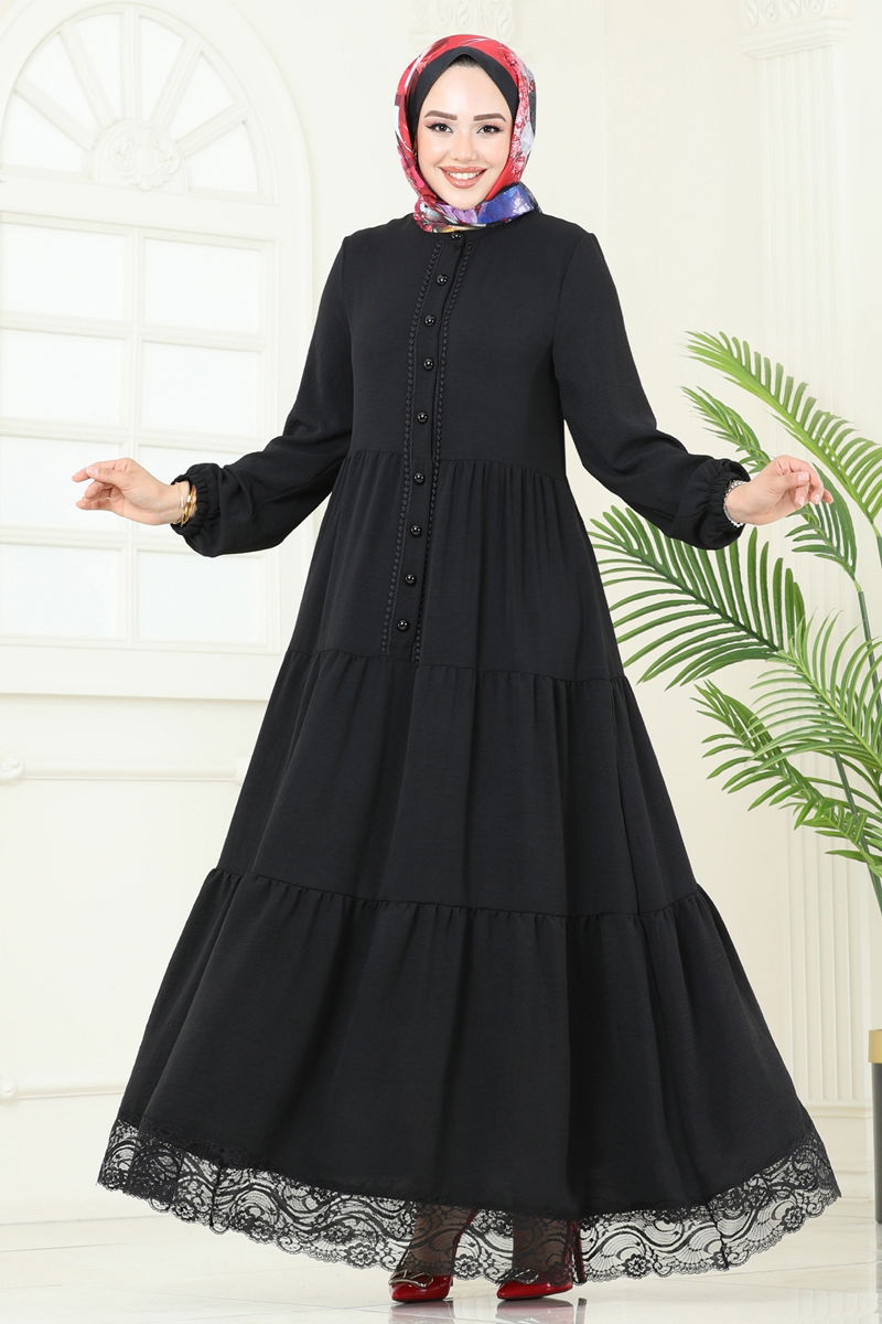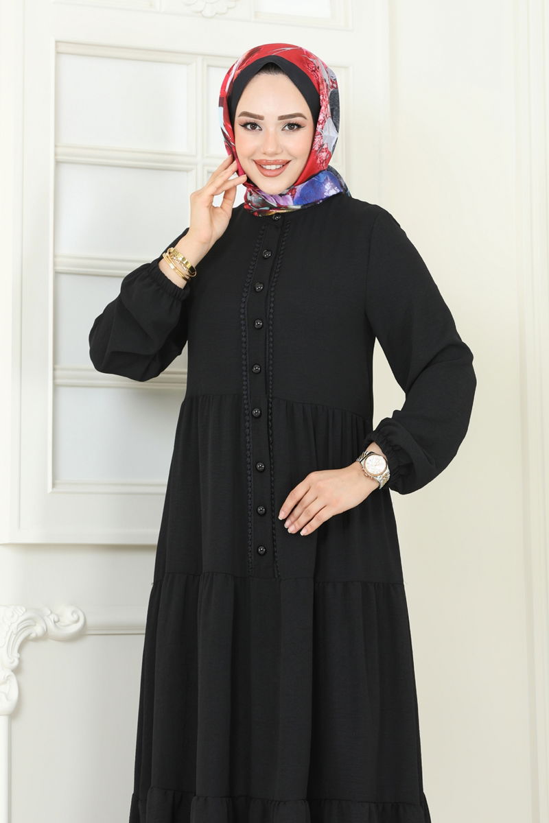 The Aerobin Dress with lace details combines elegance and comfort in modest wear. Suitable for all seasons, this dress is made from breathable Aerobin fabric. It can be gently washed at 30 degrees. Featuring a half-mandarin collar and half-button front design, it offers practicality and style. The elasticated cuffs and unlined structure of the dress ensure comfort throughout the day.