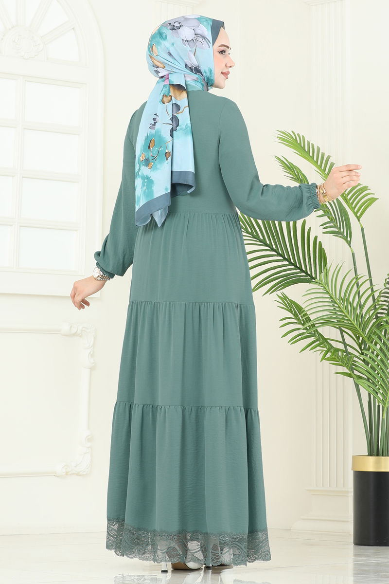 The Aerobin Dress with lace details combines elegance and comfort in modest wear. Suitable for all seasons, this dress is made from breathable Aerobin fabric. It can be gently washed at 30 degrees. Featuring a half-mandarin collar and half-button front design, it offers practicality and style. The elasticated cuffs and unlined structure of the dress ensure comfort throughout the day.