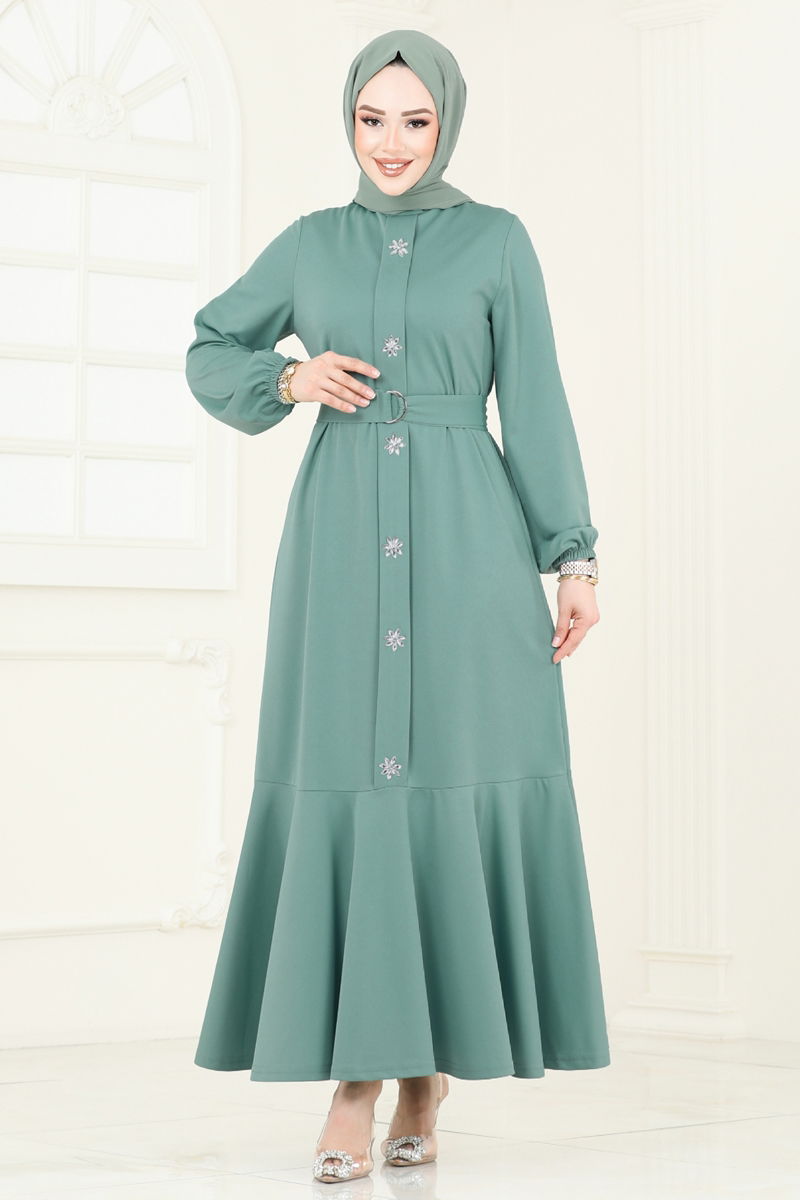 This elegant Stone Front Hijab Dress can be comfortably worn in any season. Washable at 30 degrees with a gentle cycle, this dress is made from high-quality Mira fabric. It features a bike neck and a lining-free design that offers a contemporary look. The dress's Stone details are adhesive and the belt detail adds elegance. The belt is sewn at both ends with an unstitched middle and can be optionally removed. With elastic cuffs, this dress is pulled over the head and will definitely turn heads.