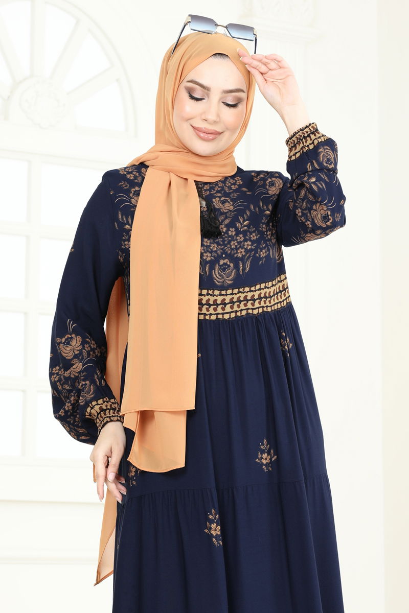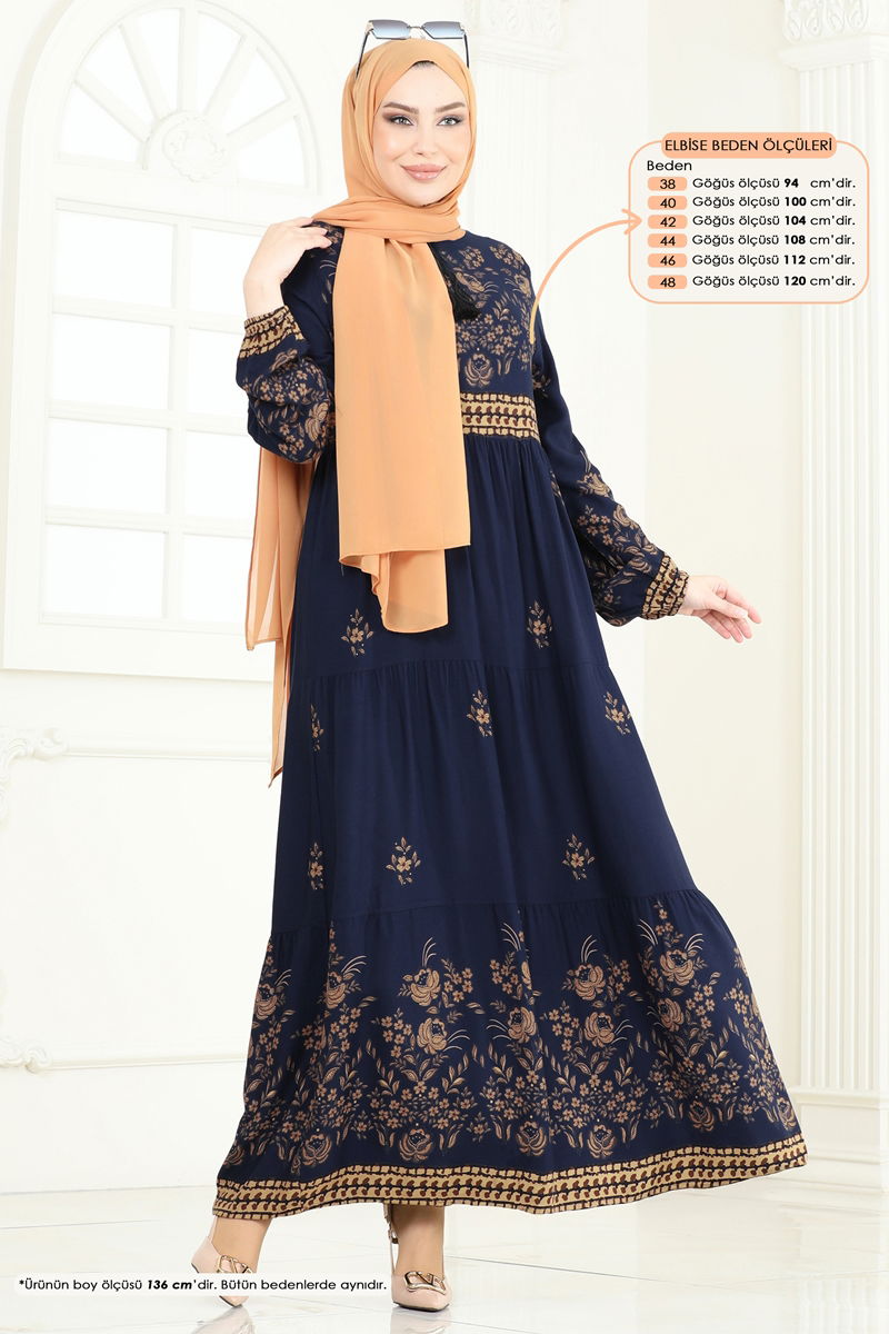 Lace-up Collar Patterned Viscose Dress is a modest fashion item. It can be worn in the Spring and Summer seasons. Hand wash is recommended. It is made Viscose fabric. The product has a V collar and is unlined. (The product on the model is size 38.) Height: 160 cm, Chest: 82 cm, Waist: 68 cm, Hips: 96 cm, Weight: 53 kg. The cuffs are elastic.