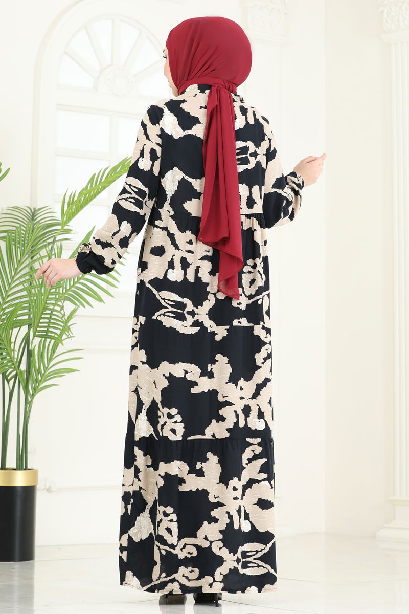Featuring an innovative and stylish design, the Patterned Viscose Dress can be comfortably worn in all seasons. Made of lightweight, breathable viscose fabric, this dress should be hand washed. It offers a V-neck design and elastic cuffs, providing comfort with its unlined structure. The buttons at the front add a chic detail as well as practicality for day-to-day use. Available in size 38 with the ideal measurements: Height: 167 cm, Chest: 90 cm, Waist: 70 cm, Hips: 100 cm, Weight: 59 kg. This dress complements your daily style and is a suitable choice for modest wear.