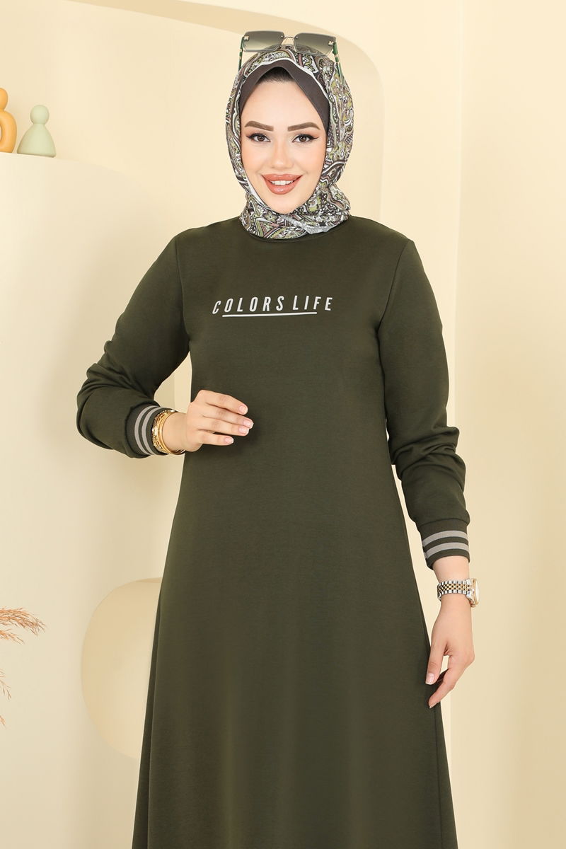 The Printed Text Covered Dress combines unique design with comfort, suitable for all seasons. Made from dual-thread fabric, this dress is distinguished by its printed texts. Ensure to wash it inside out and iron on the reverse for ease of care. With its crew neck and unlined structure, it offers a modern and elegant look. The product on the model is size 38.