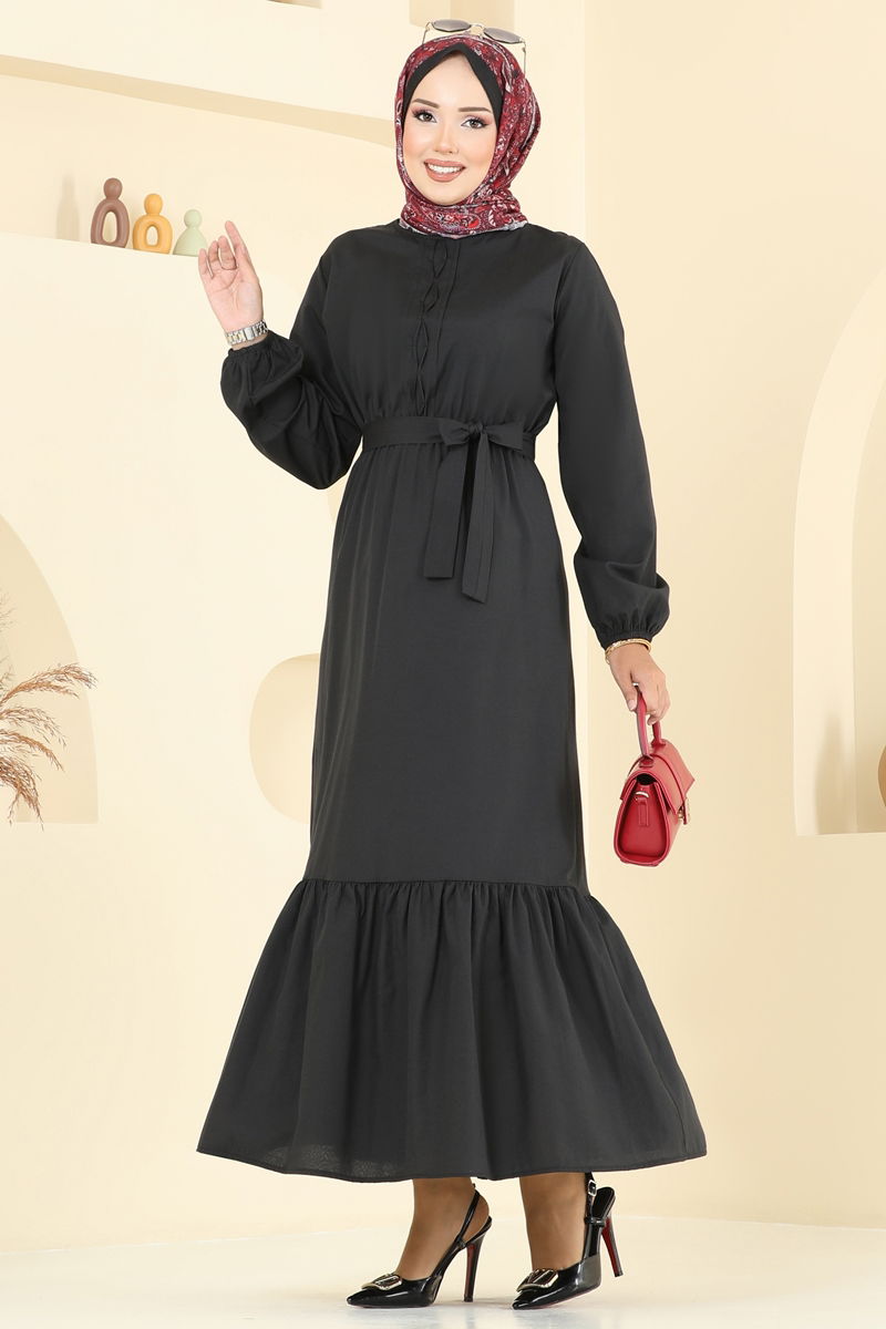 The Elastic Waist Tericot Dress is a stylish choice that will accompany your modest fashion throughout the four seasons! Offering hassle-free washing at 30 degrees, this dress is made from terrycot fabric, providing both comfort and elegance. Its crew neck and elastic cuff design give it a modern look, while its unlined structure adds to its lightness. The elastic detail at the waist ensures comfortable wear. It can be easily worn and removed using the button at the back. The belt included with the dress can be optionally removed, allowing for different styling options.