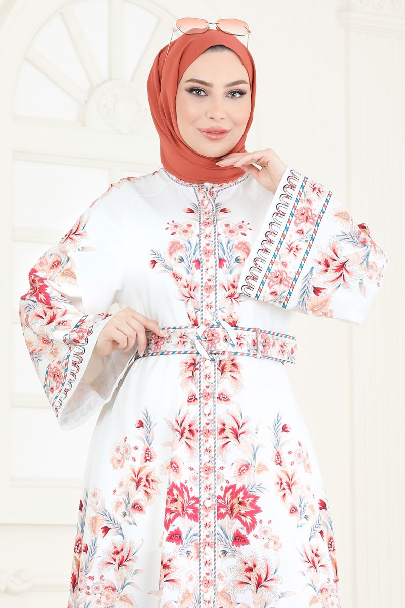 Refresh your wardrobe with the SUAL Ethnic Pattern Modest Dress, perfect for year-round wear. Crafted from 100% atlas fabric, this dress is designed for delicate wash to maintain its elegance. It features a semi-high collar and front-buttoned design for practical and stylish wear. The dress is unlined to keep it lightweight, while the belt detail adds a modern twist. Ideal for both everyday wear and special occasions. The specified model is a size 38, and the belt is optionally detachable. Enjoy the ethnic touch with its Selanik sleeves!