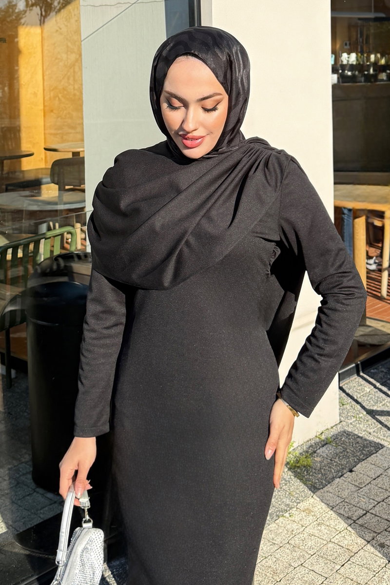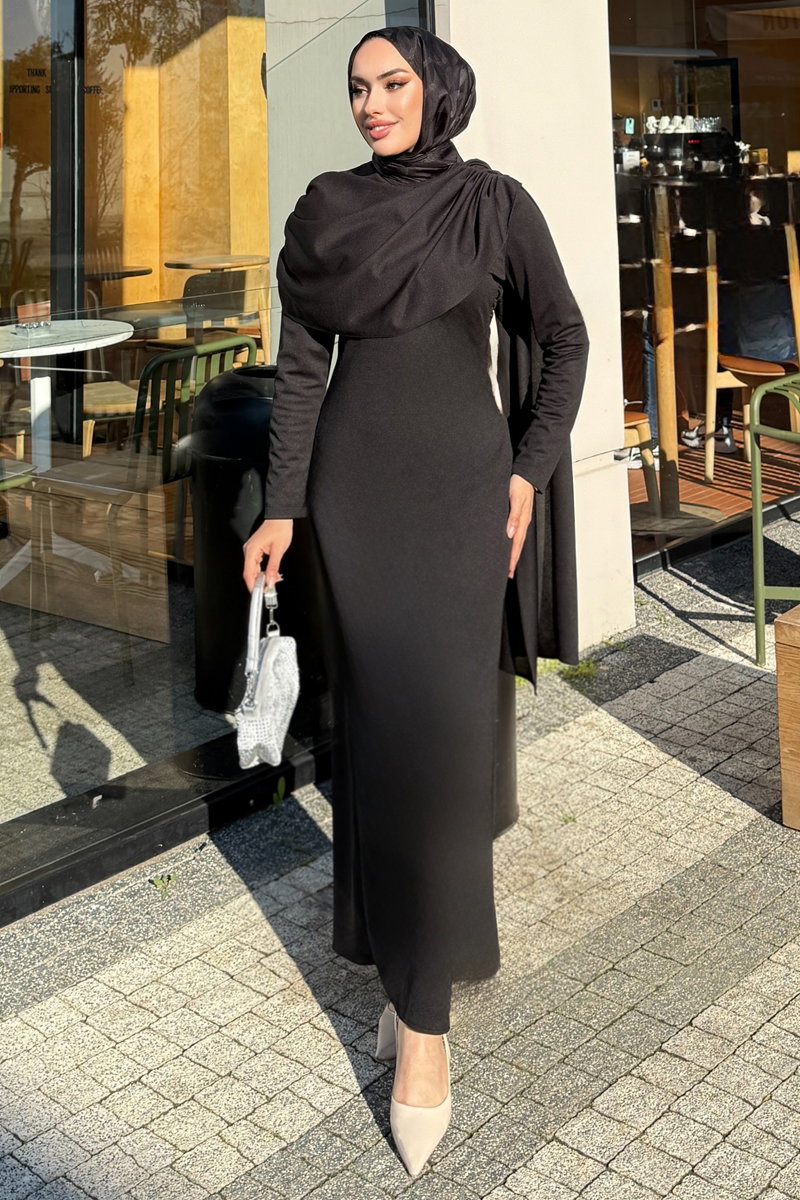 The Front Draped Knit Crepe Dress is an elegant modest wear piece suitable for all seasons. Featuring a crew neck and a zipper at the back, its design stands out with modern lines. The unlined structure offers both lightness and comfort. With its capability to be washed at 30 degrees for delicate items, it ensures practicality and durability. The size 38 on the model provides an ideal fit.