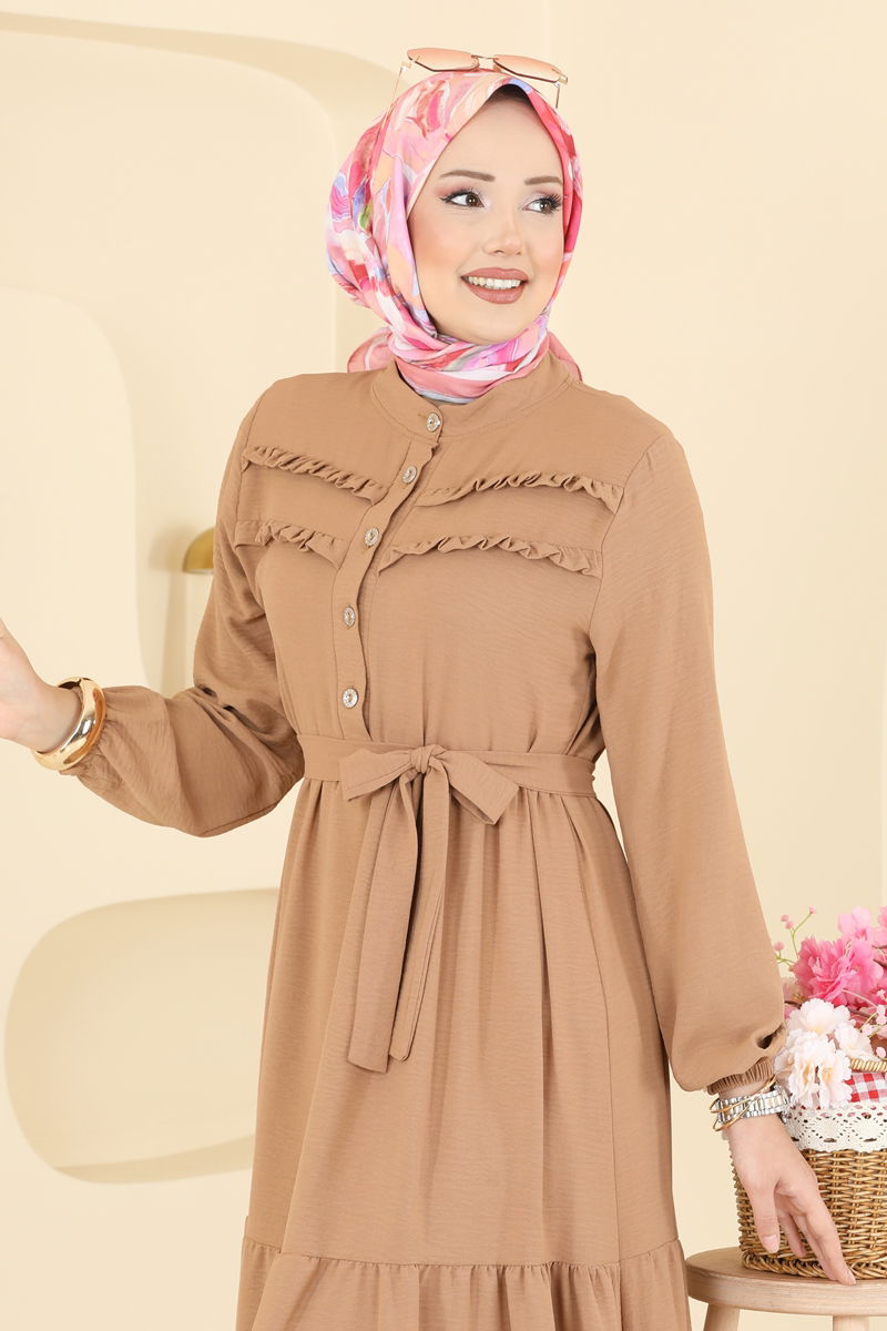 المنتج لديه ياقة نصف بيضوية. المنتج به أزرار نصف أمامي. غير مبطنة. الحزام متضمن، ،يمكن استخدامها حسب الرغبة السوار مطاطي. قد يكون هناك اختلاف في الدرجة اللونية في المنتج بسبب التقاط الصور الفوتوغرافية.
