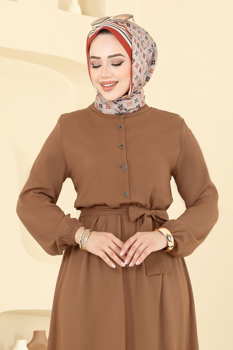 The Front Half-Buttoned Dress is ideal for those who prefer modest clothing. Suitable for all seasons, this dress is made from high-quality viscose fabric. It offers a practical yet stylish look with front half-button details. Featuring a semi Mandarin collar and elastic cuffs, it presents a modern posture. The included belt, which can be optionally used, enhances your silhouette. It is recommended to wash delicately at 30 degrees Celsius.