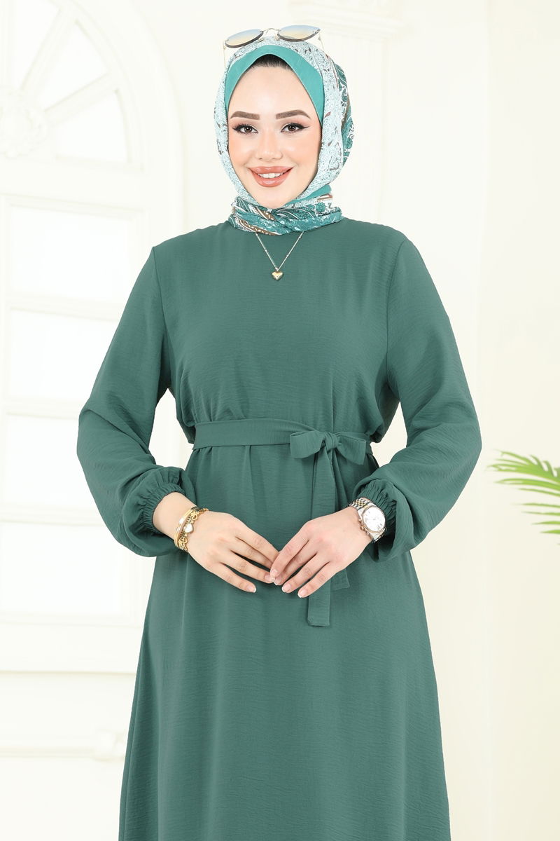 This elegant and comfortable Cuff Elastic Aerobin Dress can be easily worn throughout all seasons. It offers practical use with its 30-degree delicate wash feature. Made from Aerobin fabric, this dress stands out with its crewneck and unlined design. The model displayed is a size 38 and features a back-button which enables easy overhead dressing. The belt included with the dress can be optionally removed. With elastic cuffs, this dress ensures you always look chic.