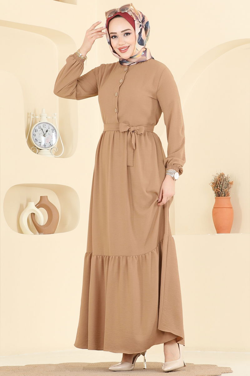 The Tiered Skirt Aerobin Dress is an elegant choice suitable for modest fashion. It can be comfortably worn throughout all seasons. Offers gentle washing at 30 degrees. With a mandarin collar and half-button details, it presents a modern look. Its lining-free design and stitched waist ensure a comfortable fit. The belt included with the product can optionally be used, complementing your elegance. With elastic cuffs, this dress is both stylish and practical.
