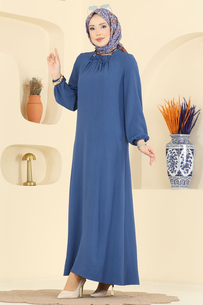 Product Name: Square Neck Aerobin Dress. This chic modest dress can be comfortably used in all seasons. It can be cleaned with gentle wash at 30 degrees Celsius. Featuring a square neckline for a modern look, this dress is unlined and has elastic cuffs. The strap details are complementary accessories. (The product on the model is size 38.)