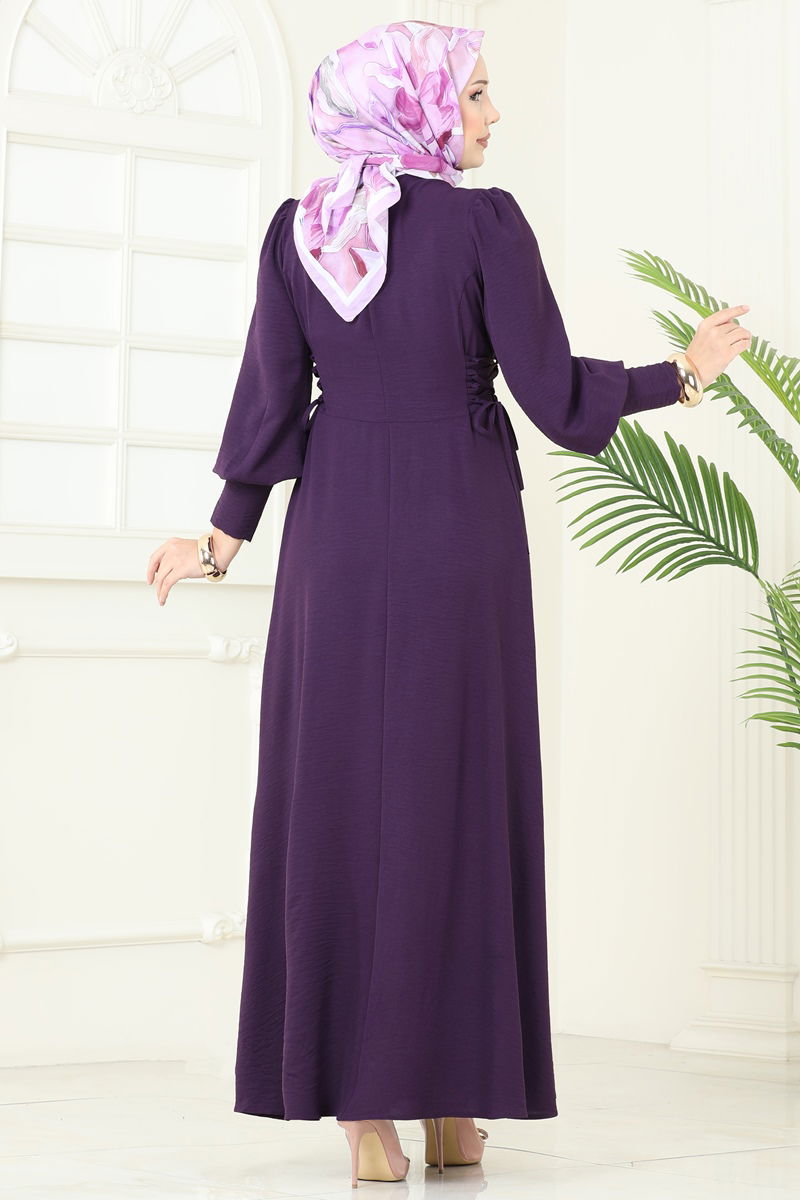The Side Lace-Up Aerobin Dress is a specially designed modest wear suitable for all seasons. Featuring an elegant bike neck, a usable back button, and made from Aerobin fabric, this unlined dress has a belted waist. The side lacing allows for adjustable comfort and adds a modern touch to your style. This model is size 38 and requires gentle care, recommended to be washed at 30 degrees without spinning.
