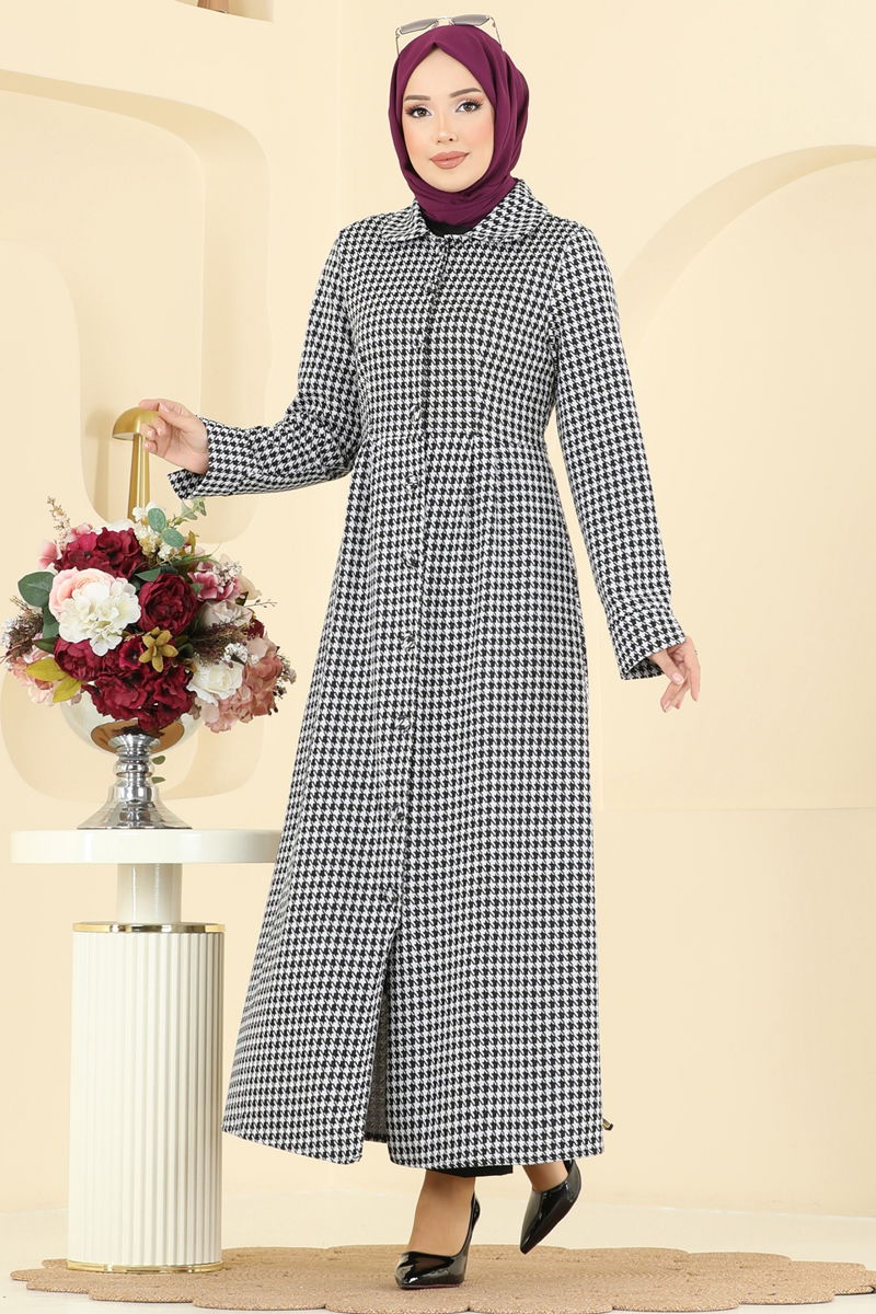Maintain your style during the autumn and winter months with this chic houndstooth patterned modest dress. The shirt collar and front button design offer both a modern and classic look. Recommended to be washed gently at 30 degrees, this dress is unlined for comfort. It features a seamed waist, and the model displayed is size 38.