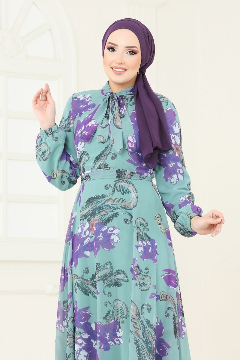 The Scarf Collar Chiffon Dress is a chic and modern modest wear option. Suitable for all seasons, it can be gently washed at 30 degrees. Made from chiffon, this lined dress features a back zipper for ease of wear. Its scarf collar adds a touch of elegance, and there is a functional button at the back. The belt is stitched at both ends, leaving the middle part open. The belt is optional and the cuffs are elasticated. The product displayed is a size 38.
