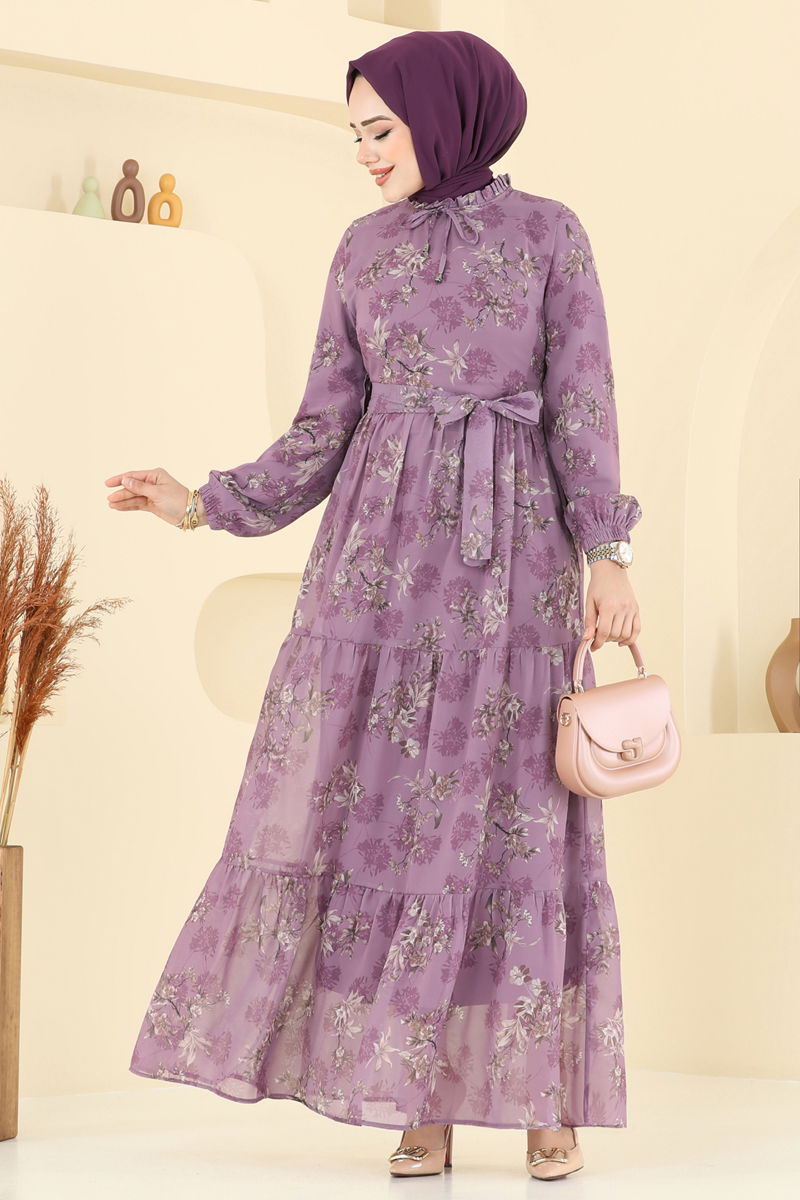 The Leaf Pattern Chiffon Dress is a stylish option that can be comfortably used in all seasons, standing out with its modest design. This modest dress can be washed at 30 degrees due to its delicate nature. Made from chiffon, the dress offers both comfort and elegance with its lined and high-collared design. It features a back zipper and elasticated cuffs. An included belt can be used to create a different style. The waist is stitched, and the belt ends are fixedly designed, while the belt can be optionally not used. The dress is modeled in size 38.Dress SIZE DIMENSIONS (CM)Size Chest Length 38 94 141 40 98 141 42 102 141 44 106 141 46 110 141 48 116 141 Weight (Kg):0.5 -