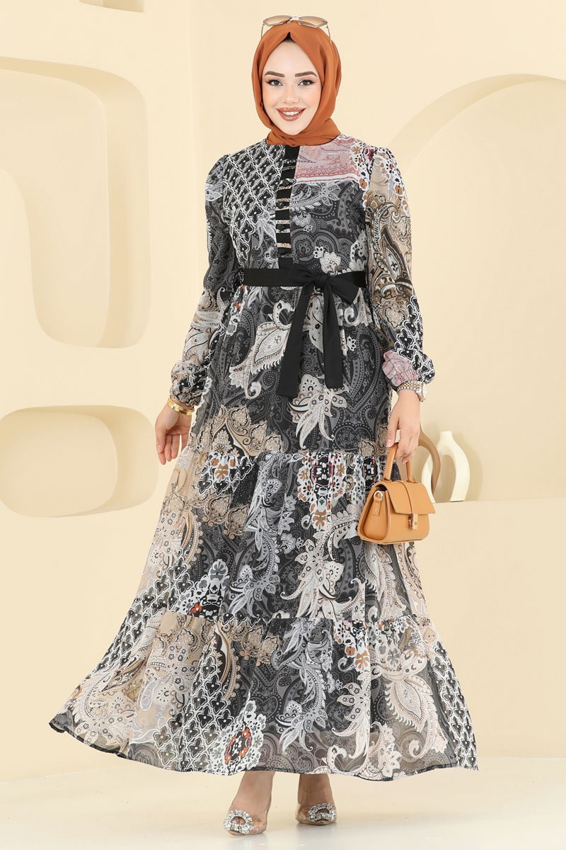 The Ethnic Pattern Chiffon Dress is a modest attire suitable for all seasons. Made from 100% chiffon, this dress can be washed at 30 degrees on a delicate cycle. It features a crew neck design and is fully lined for added elegance. The back is zippered, and the buttons are purely decorative. The belt detail is designed to prevent any waving, stitched at ends, with a middle part left seamless; it can be removed optionally. This dress also has elasticated cuffs, making it both comfortable and stylish.Dress SIZE DIMENSIONS (CM)Size Chest Length 38 96 140 40 100 140 42 104 140 44 108 140 46 112 140 48 116 140 Weight (Kg):0.49 -
