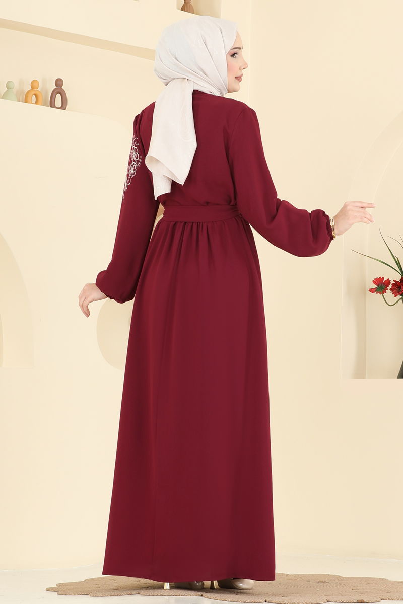 The Embroidered Crepe Dress is designed as a modest wear product and can be comfortably used throughout all seasons. This dress, which can be washed at 30 degrees with delicate care, is made from crepe fabric. It features a semi-mandarin collar and front half-button design, offering both style and practicality. The dress is unlined, has a seamed waist, and elasticated cuffs. The product displayed on the model is size 44.